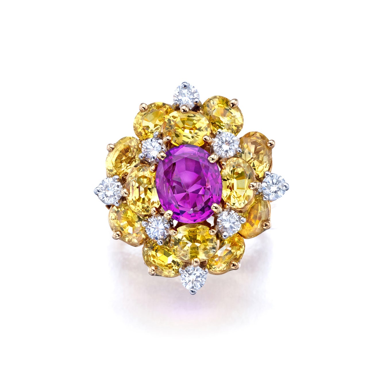 A Multi-Colored Sapphire, Diamond, Gold, and Platinum Ring
