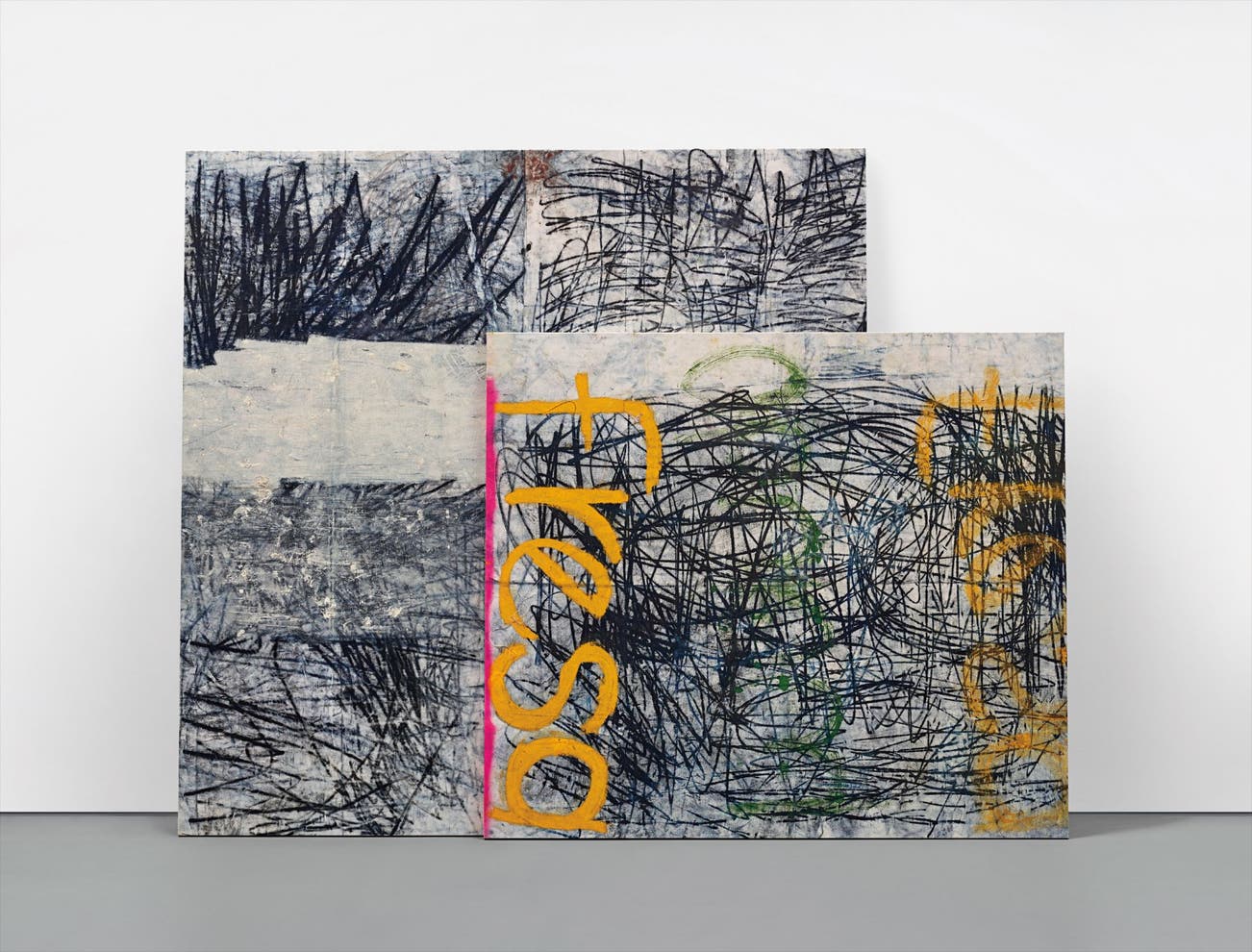 A frenzied throng of lines cascading onto a dual canvas arrangement, Oscar Murillo’s Untitled is a dynamic painting belonging to the artist’s expressive oeuvre. An amalgamation of painting, performance and installation, the present work conveys an electrifying and contagious energy. Littered with a manic and ferocious coating of scrawls, Murillo’s scribbles allude to a carnal vitality while the superimposed ‘Fresa,’ Spanish for ‘strawberries,’ instils a playful semiotic component. Furthermore, ‘Fresa’ is slang in Latin America for a preppy, upper class youngster, a notion in stark contrast to the gritty and edgy aesthetic that characterises Murillo’s work.
