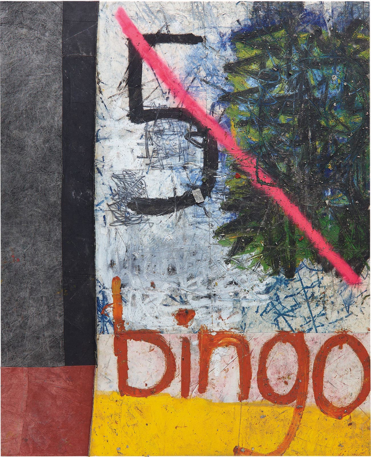 Recognisable within the varied and gestural canvas is the indication of the game Bingo, a gambling game reliant on the random selection of numbers. Bingo Paintings, also a distinct series within the artist’s oeuvre, typically present numbers on dirtied and heavily worked canvases in multiple parts. Here, the text ‘bingo’ when read together with the title, Just Dreams, moves the composition toward the realm of fate. This overt reference to gambling and the elevation of this to the status of a dream, a desire, suggests that the fate of man is uncontrollable. Interrogating chance and desire within the depth of the seemingly unresolved yet masterfully worked composition, Murillo questions the viewer’s destiny.