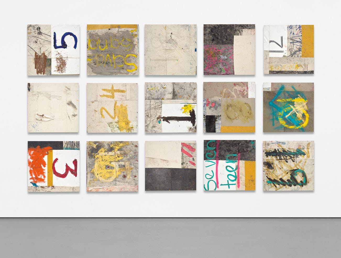 oil, oilstick, graphite, enamel paint, concrete dye, tape, dirt, newspaper and paper collage, thread and mixed media on linen and synthetic canvas, in 15 parts