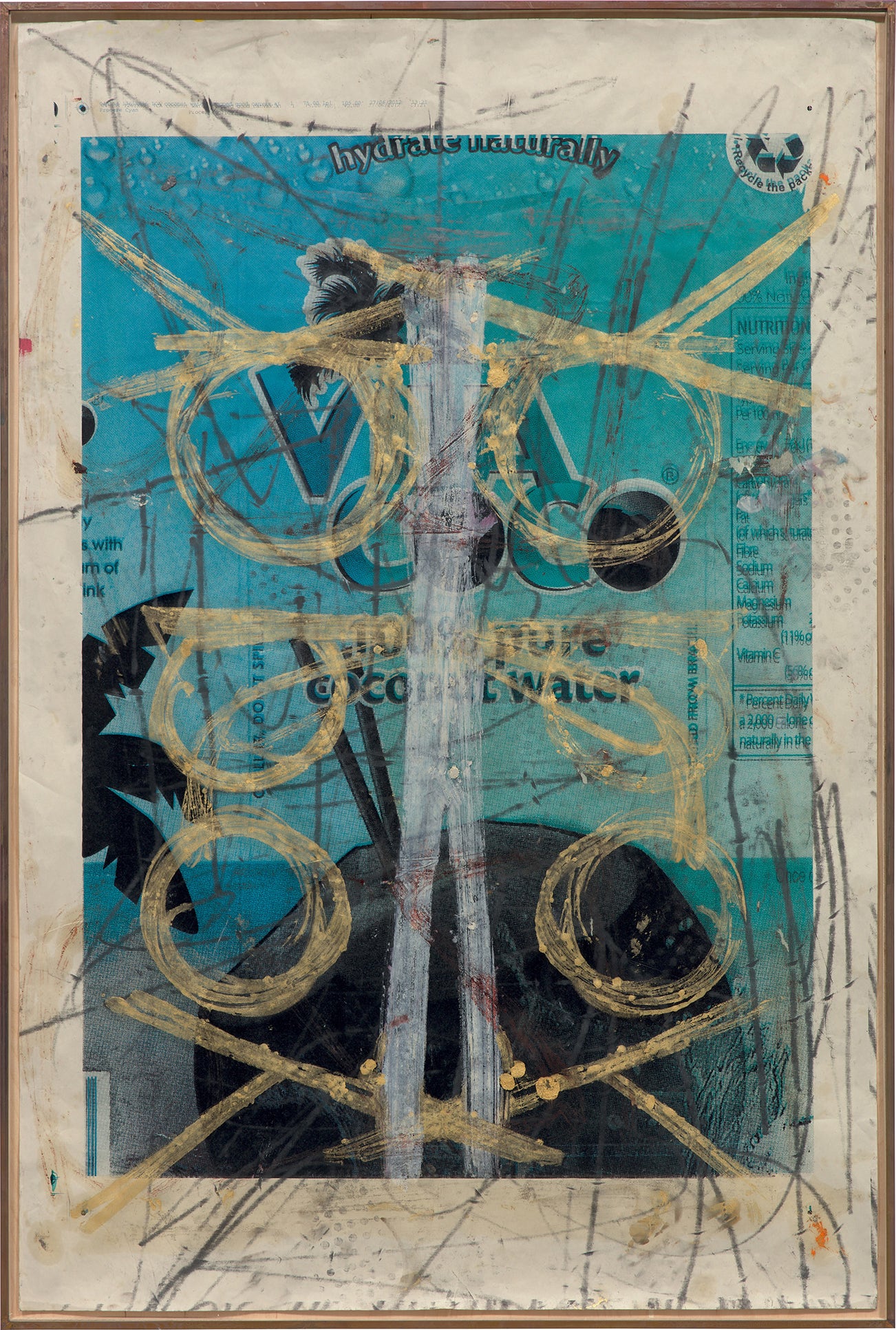oil, oilstick, silkscreen ink and aluminum foil on newspaper, in artist's copper frame