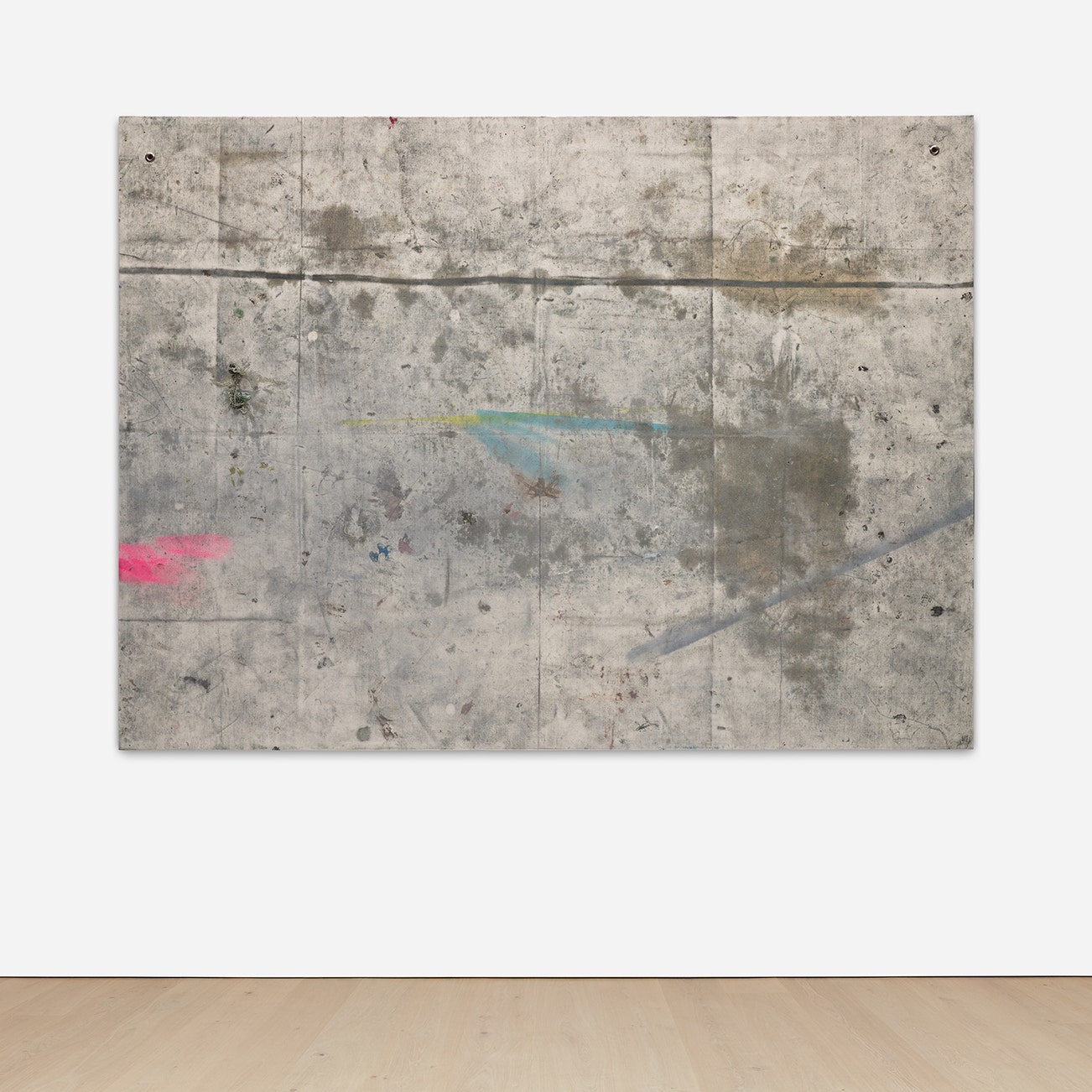 spray print, paint, tape, dirt, yarn and steel grommets on canvas