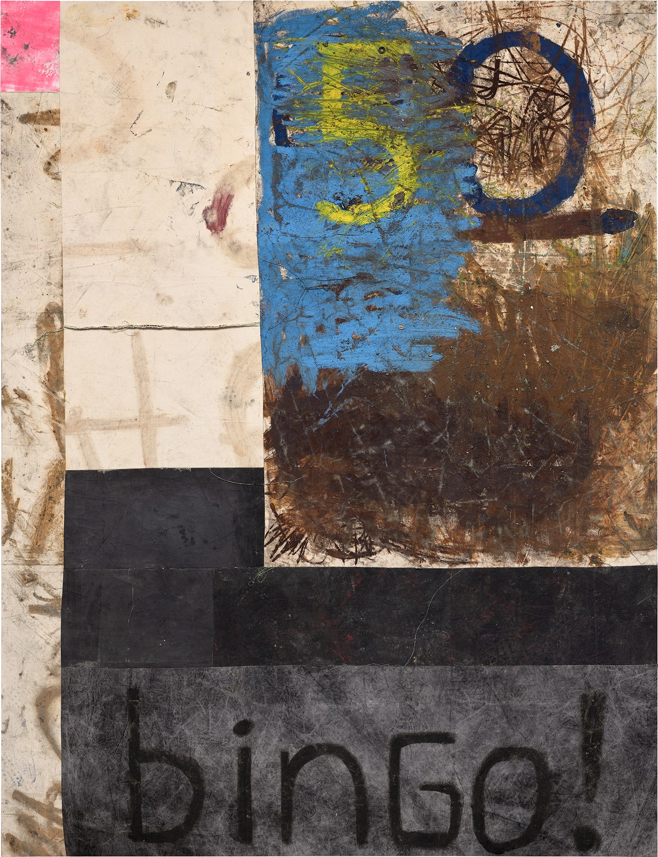 oil, oil stick and dirt on stitched canvas