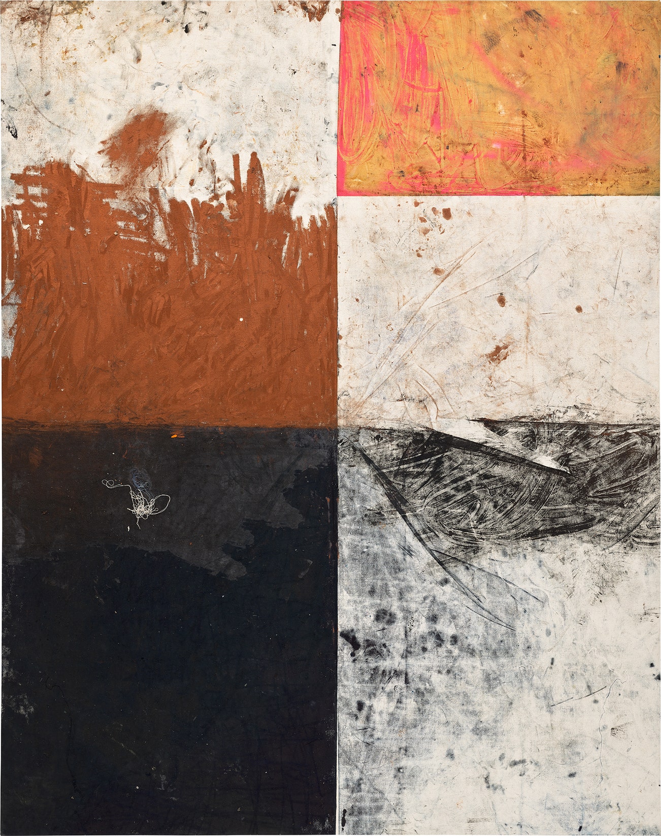 oil, oilstick, spray enamel, gloss paint, thread and dirt on canvas