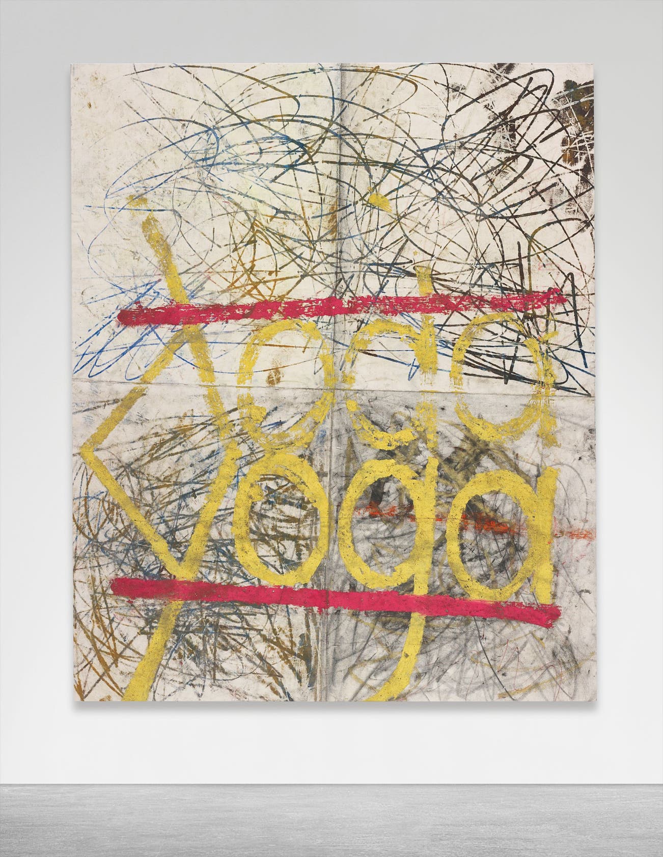 Unlike his earlier work full of stains that almost look like the studio’s floor, his 2012 series of paintings have graffiti-esque marks that bring to mind dirt and dust, as well as liquid elements, like water stains. In Untitled, 2012, Murillo has appeared to have folded the canvas so that the word, yoga, appears as if mirrored in the paint’s absorption onto the other side of the fold. The word has gained a duality of meaning in the work; it is not only visually representative but holds a formal composition. For Murillo performance and painting are inextricably allied, exploring the functionality of displaced words, like cultural displacement with performance, in painting its material displacement, resulting in a greater poetic sensibility to his work.