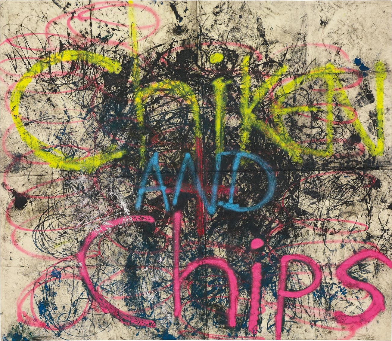 The current lot exemplifies this practice, as it is at once gestural— underscoring the performative dimension of his process—and narrative in its incorporation of text as a direct link to his own mixed cultural history. The prominence of “Chicken AND Chips” is emblematic of the artist’s penchant for using the canvas as a personal archive and as a means of carrying on a performance into perpetuity. In this case, that dialogue is rooted in food and in his adoptive Anglo-Saxon heritage. This achievement is echoed in his inclusion of detritus from his everyday life. Be they actual food parts, dirt or dust, all are parts of the same whole that comprise the artist’s evolving identity.