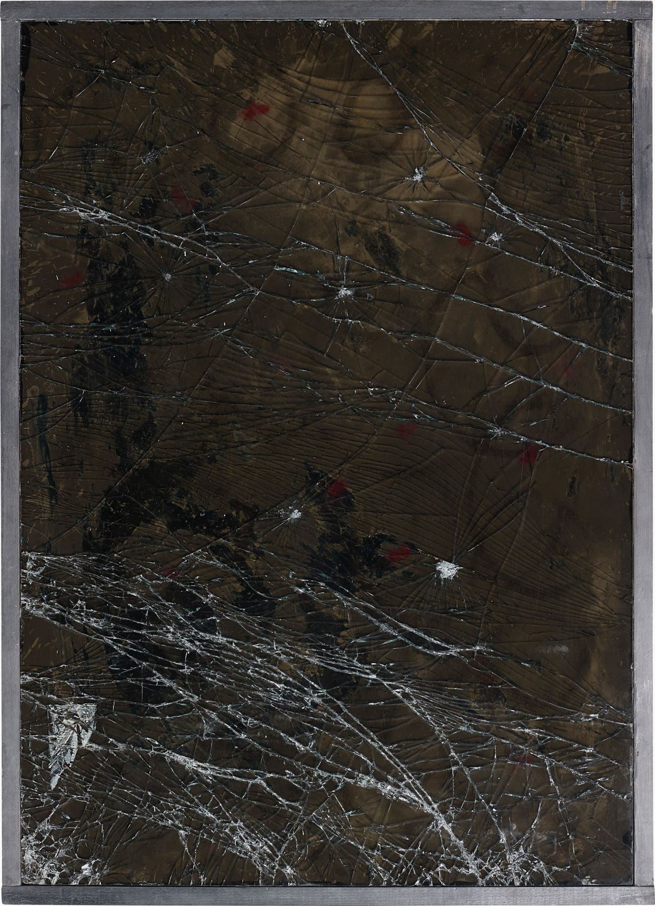 shattered black glass, paint, concrete, wire mesh, painted wood