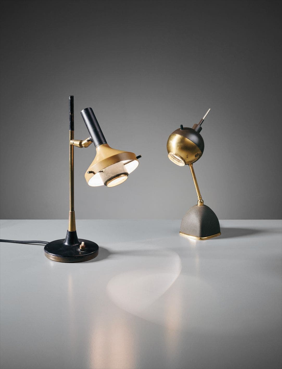 Manufactured by Lumi, Milan, Italy. Base of smaller lamp stamped BREVETTATO and underside with manufacturer's plastic label LUMI/MILANO.
