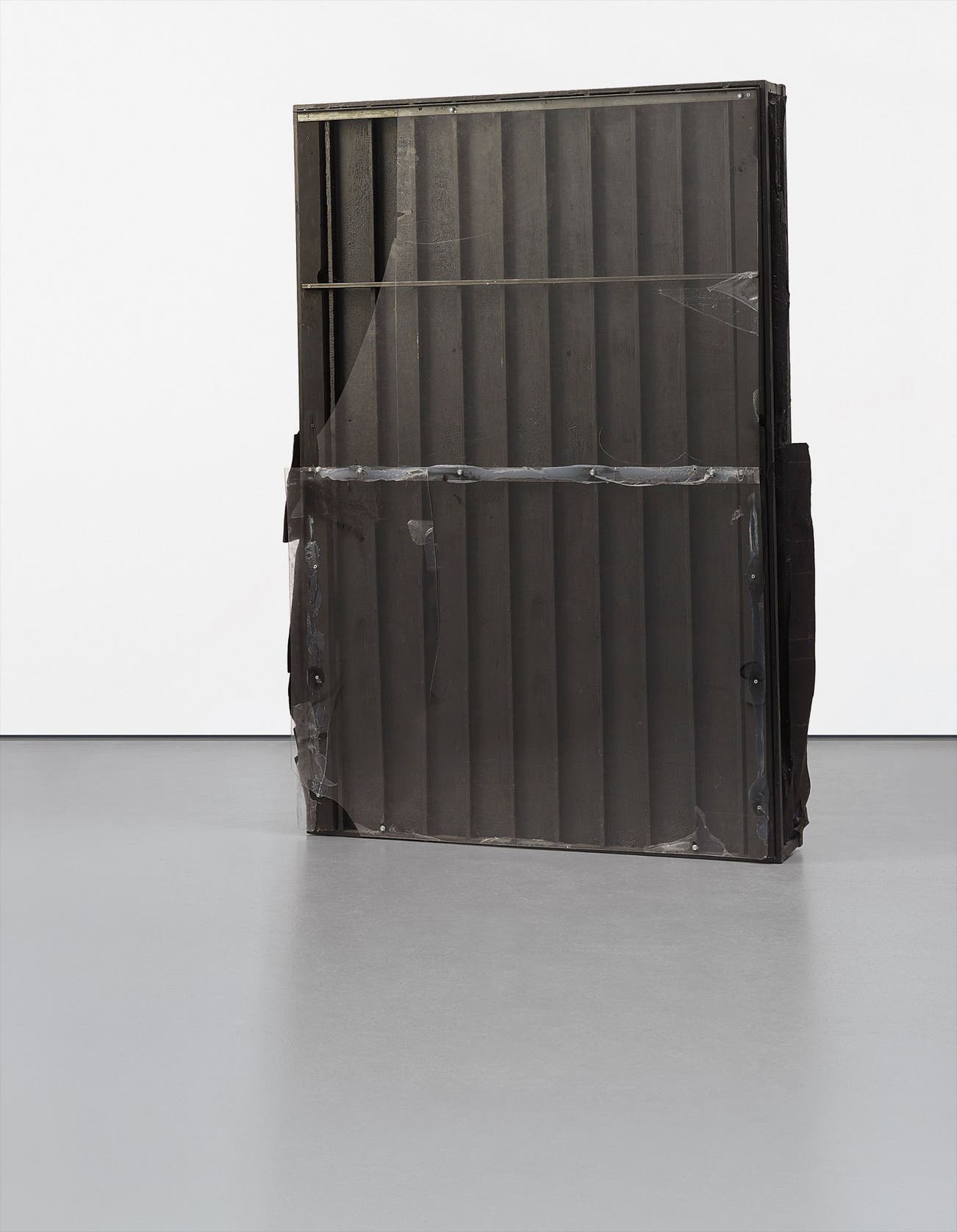 steel, charred plywood, cardboard, perspex, asphalt paste, asphalt felt, glue, silicone, spray enamel, epoxy resin
