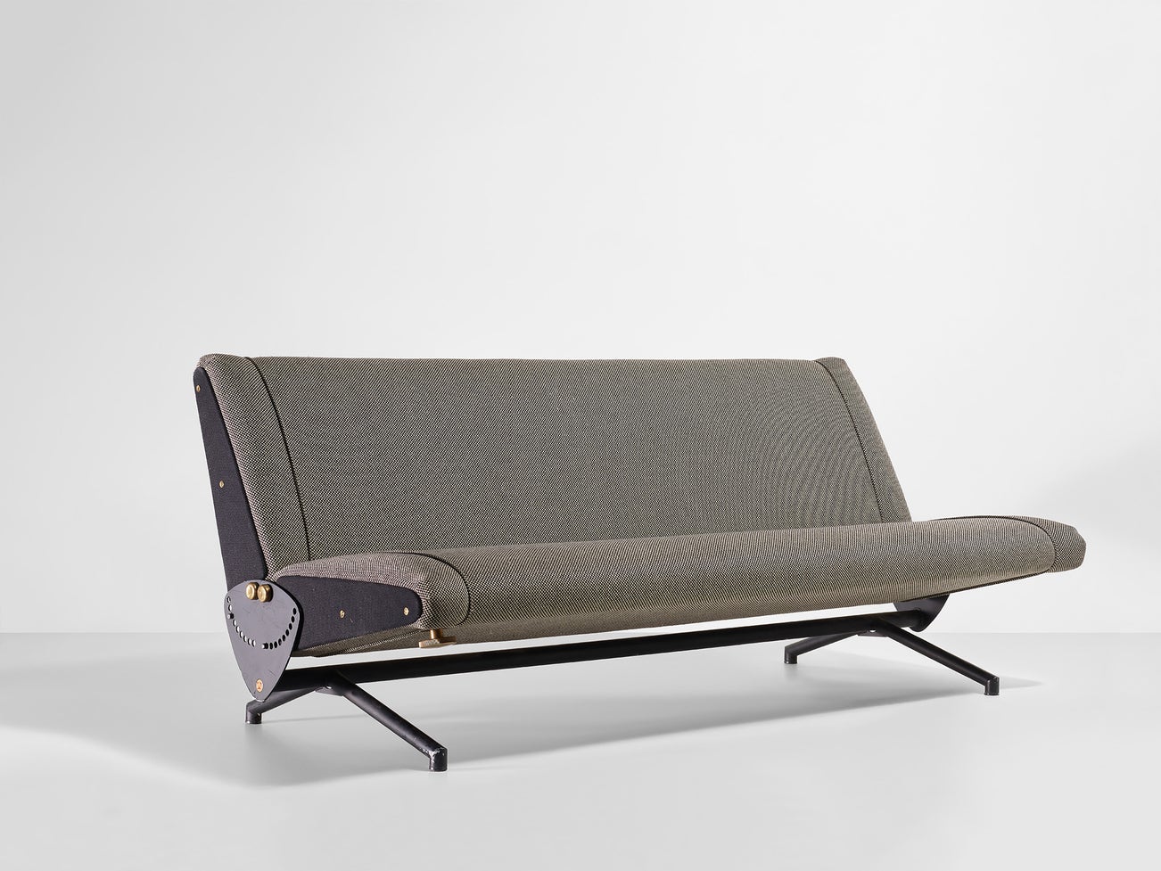 enameled steel, brass and upholstery