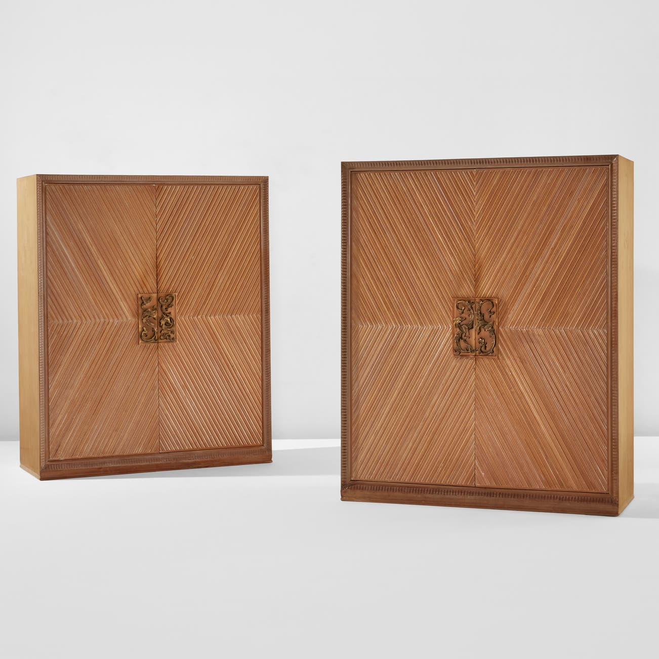 Manufactured by Arredamenti Borsani, Varedo, Italy. Bronze handles designed by Lucio Fontana for Arredamenti Borsani. Interior of each wardrobe with metal plaque impressed AB/V/ARREDAMENTI/BORSANI/Varedo (Milano). Interior of one wardrobe with additional paper label printed PRINCIPE. Together with a certificate of expertise from the Osvaldo Borsani Archive.
