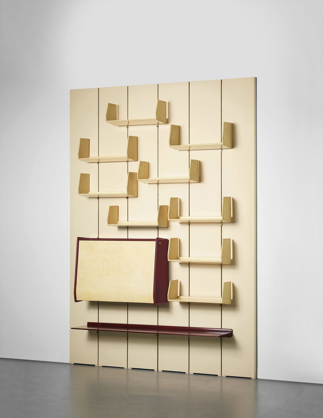 Painted wood, plastic-laminated wood, velum-covered wood, mahogany, glass, mirrored glass, brass.