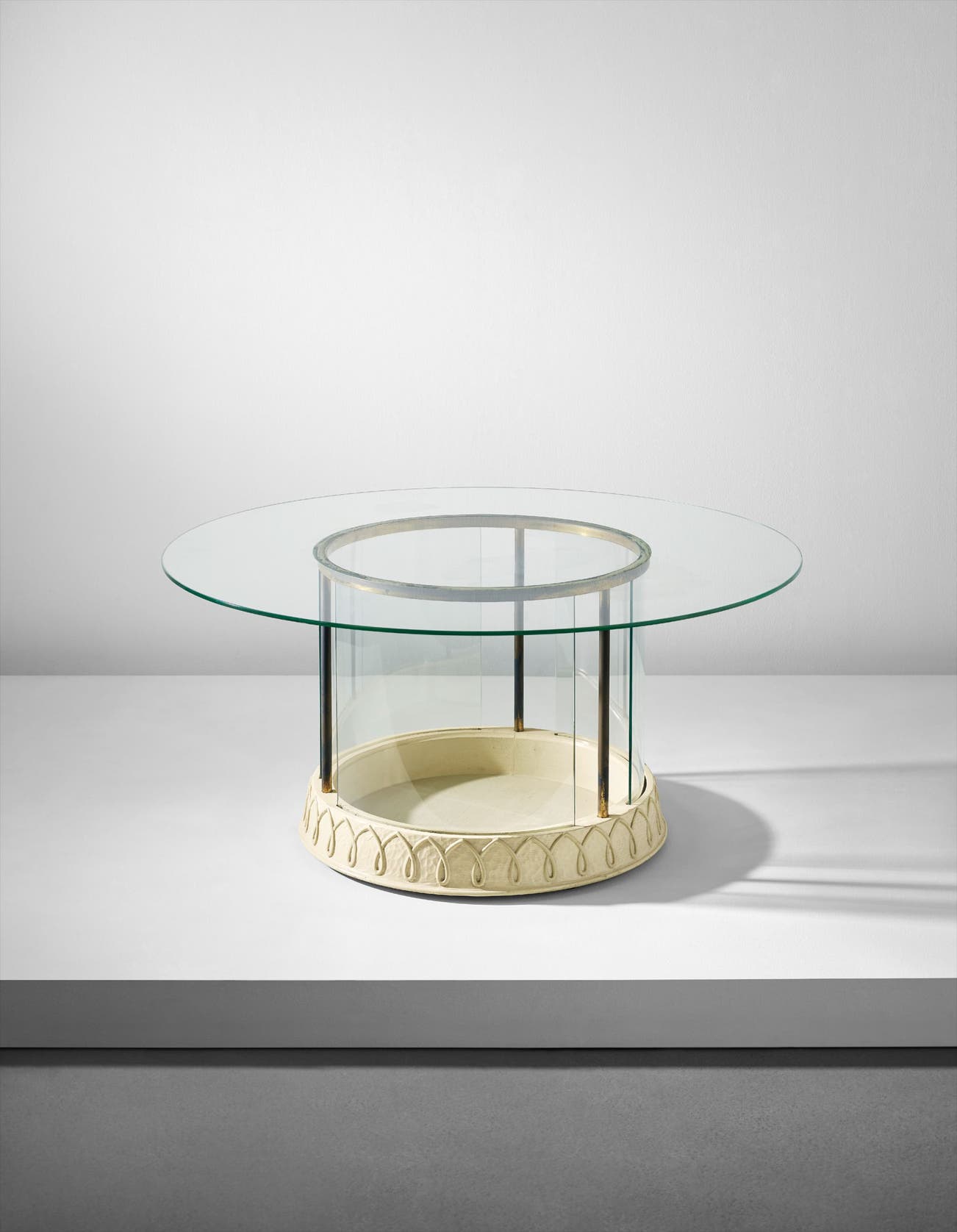 Painted wood, brass, glass.