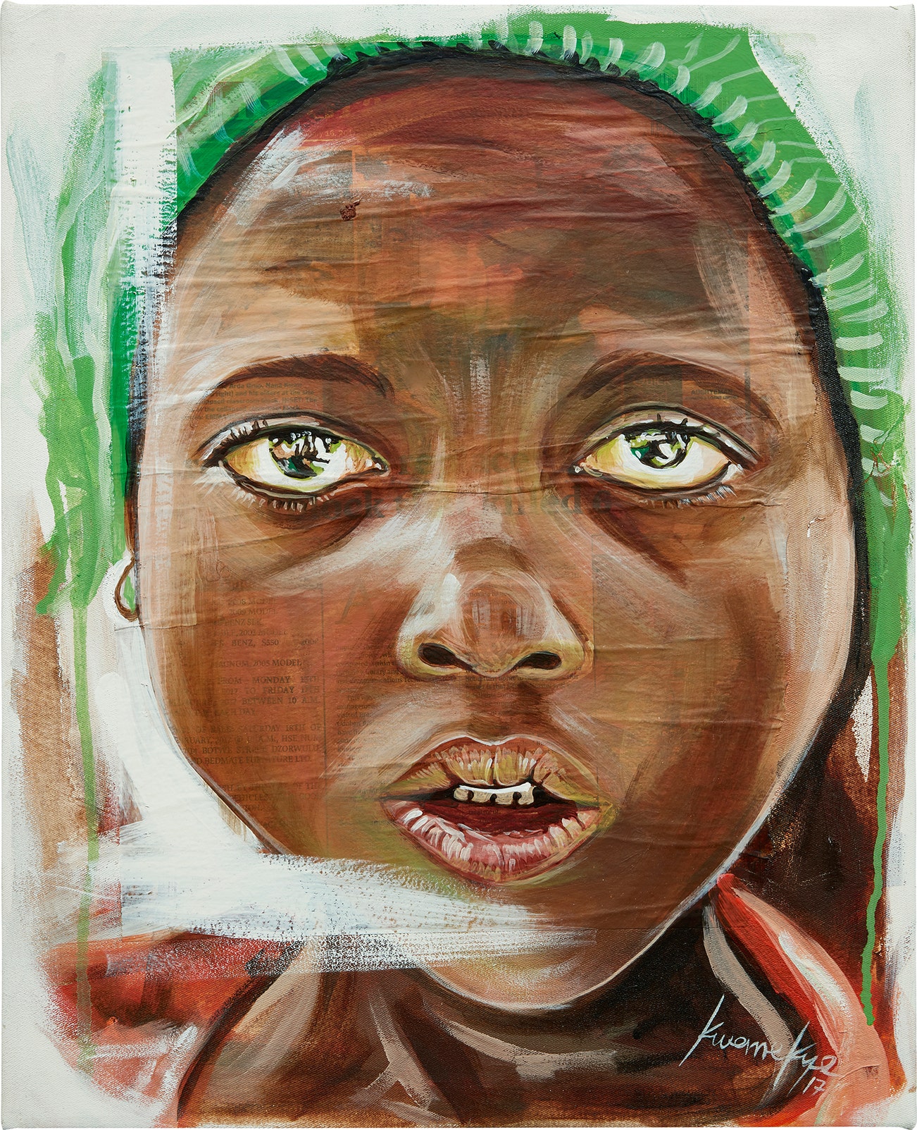 GhanianOtis Kwame Kye Quaicoe paints empowering images of black men and women set against lush monochromatic backgrounds. His portraits of friends and family are celebrations of blackness and reclamations of lost and forgotten cultural dignity. He uses color, the primary instrument of self-expression in his native Ghana, as a language of transformation to create a dynamic of cultural, political, and personal redemption. Quaicoe was born in Accra, Ghana, where he was first introduced to painting by the expressive, highly stylized posters painted by local artists to advertise upcoming films, and attended the Ghanatta College of Art and Design for Fine Art in Accra, where he studied painting. He lives and works in Portland, Oregon.