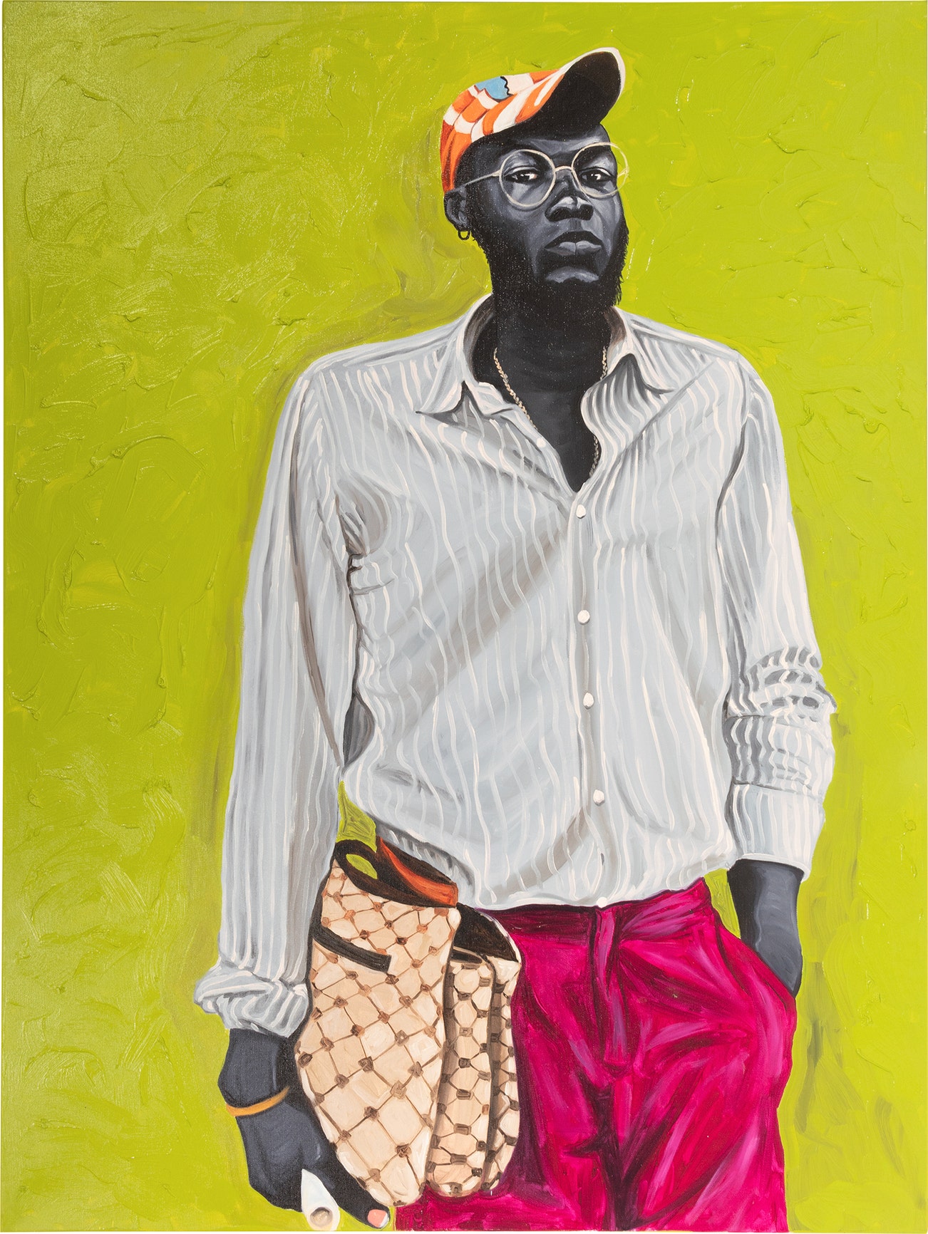 GhanianOtis Kwame Kye Quaicoe paints empowering images of black men and women set against lush monochromatic backgrounds. His portraits of friends and family are celebrations of blackness and reclamations of lost and forgotten cultural dignity. He uses color, the primary instrument of self-expression in his native Ghana, as a language of transformation to create a dynamic of cultural, political, and personal redemption. Quaicoe was born in Accra, Ghana, where he was first introduced to painting by the expressive, highly stylized posters painted by local artists to advertise upcoming films, and attended the Ghanatta College of Art and Design for Fine Art in Accra, where he studied painting. He lives and works in Portland, Oregon.