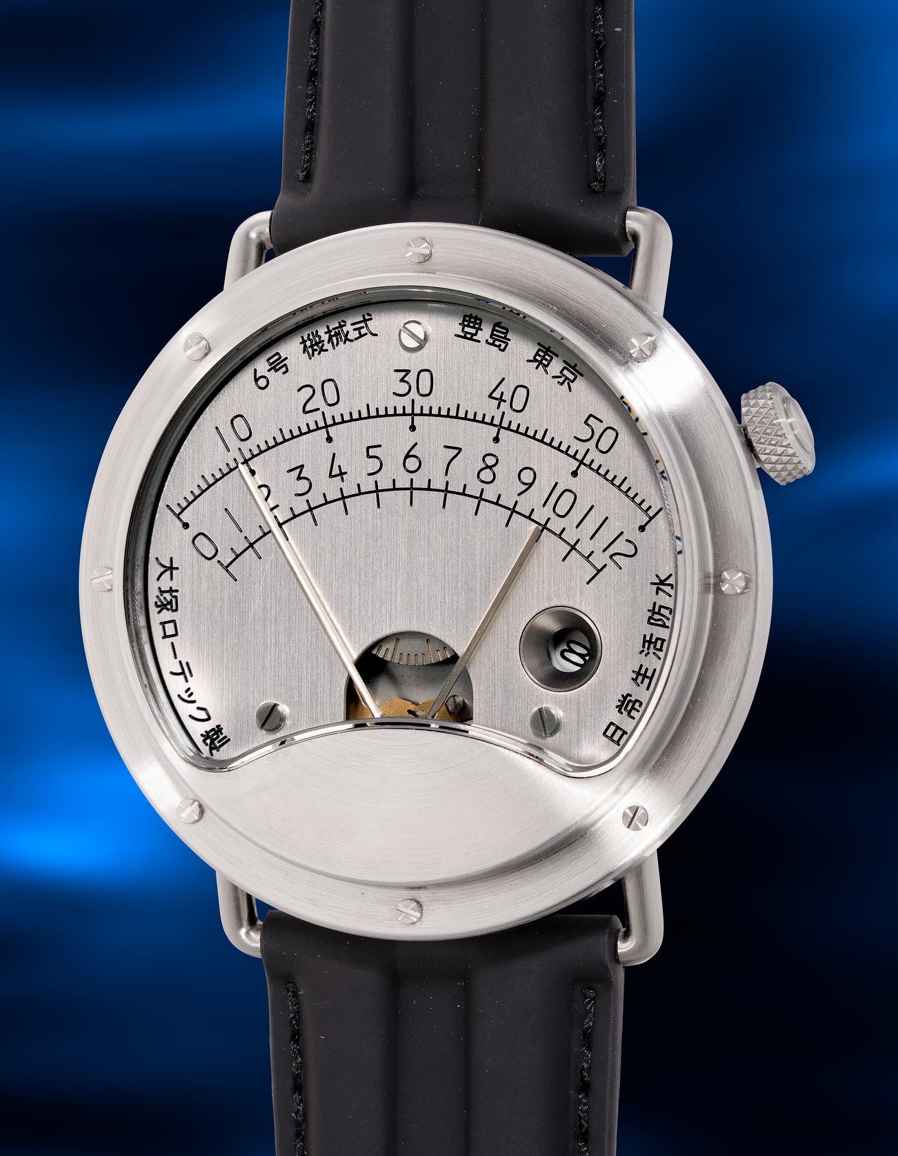 - The Otsuka Lotec Model No. 6 exudes a distinct steampunk vibe, with its case featuring a straight-grained finish and a bezel secured with eight screws, reminiscent of an analog metering device akin to an air pressure gauge. The monochromatic dial housing the retrograde hands has a raw, industrial design, with exposed screws and deliberate text elements that add to the overall steampunk aesthetic.