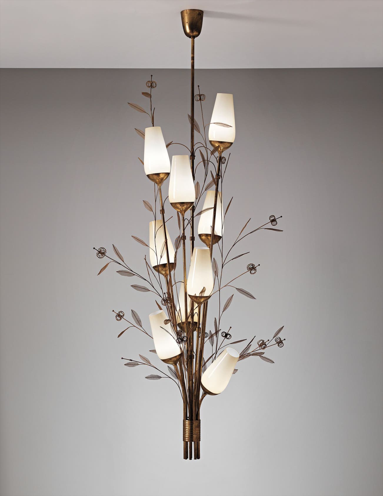 Amber glass, brass, tubular brass, painted mesh metal.