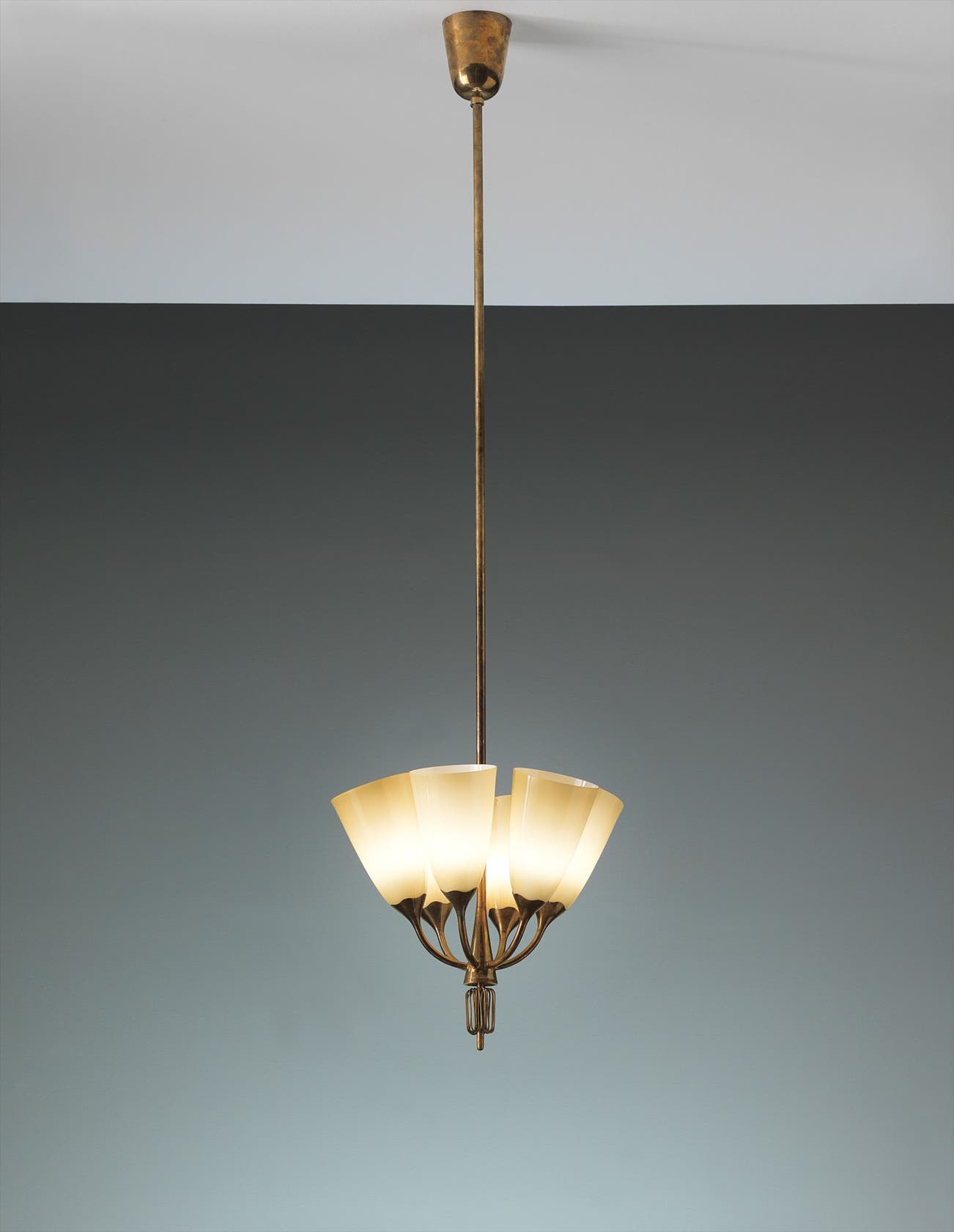 Tubular brass, amber glass.