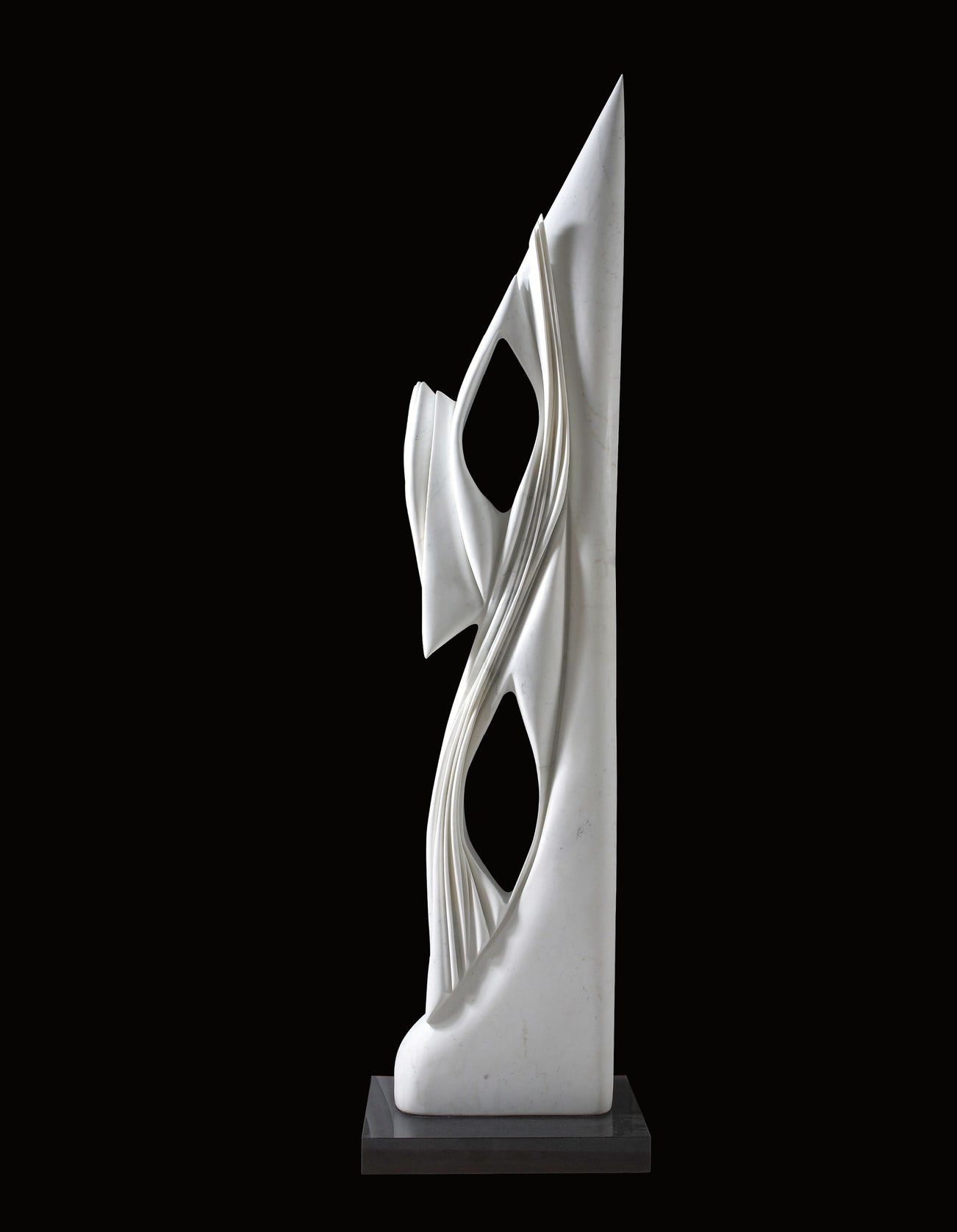 Best known for his monumental marble works, Pablo Atchugarry creates sculptures with a uniquely architectural presence. The present lot is the largest work by the artist to ever come to auction, featuring sensual, curvilinear folds that reference the draped tunics found in classical Greek and Roman antiquities. Hand-carved by the artist with tremendous skill, the silky smooth, undulating surface of Untitled also evokes flowing water, thereby emitting a calming presence. However, its solidity and columnar form simultaneously seems to nod to national monuments, projecting a dominating quality, enhanced further by its culmination in a sharply pointed tip.