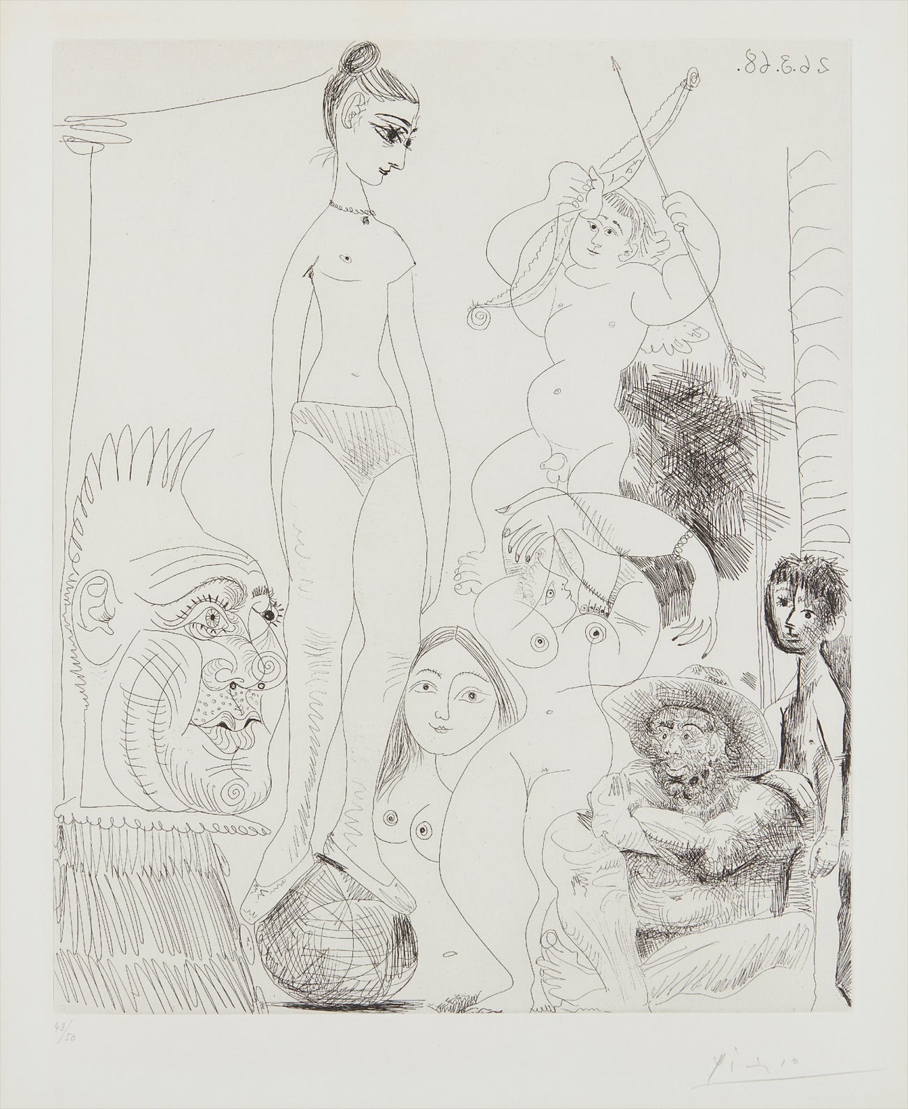 Autoportrait transposé et dédoublé rêvant au cirque, avec Jacqueline en acrobate à la boule (Self-Portrait Transposed and Split Dreaming in the Circus, with Jacqueline as Acrobat on the Ball), plate 9, from 347 Series