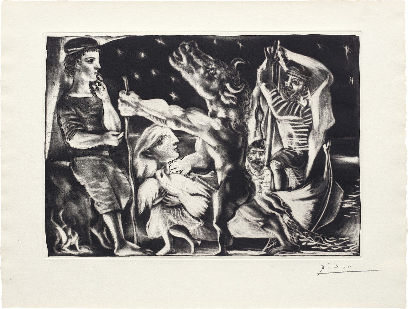 Minotaure aveugle guidé par Marie-Thérèse au pigeon dans une nuit étoilée (Blind Minotaur Guided Through a Starry Night by Marie-Thérèse with a Dove), pl. 97, from La Suite Vollard