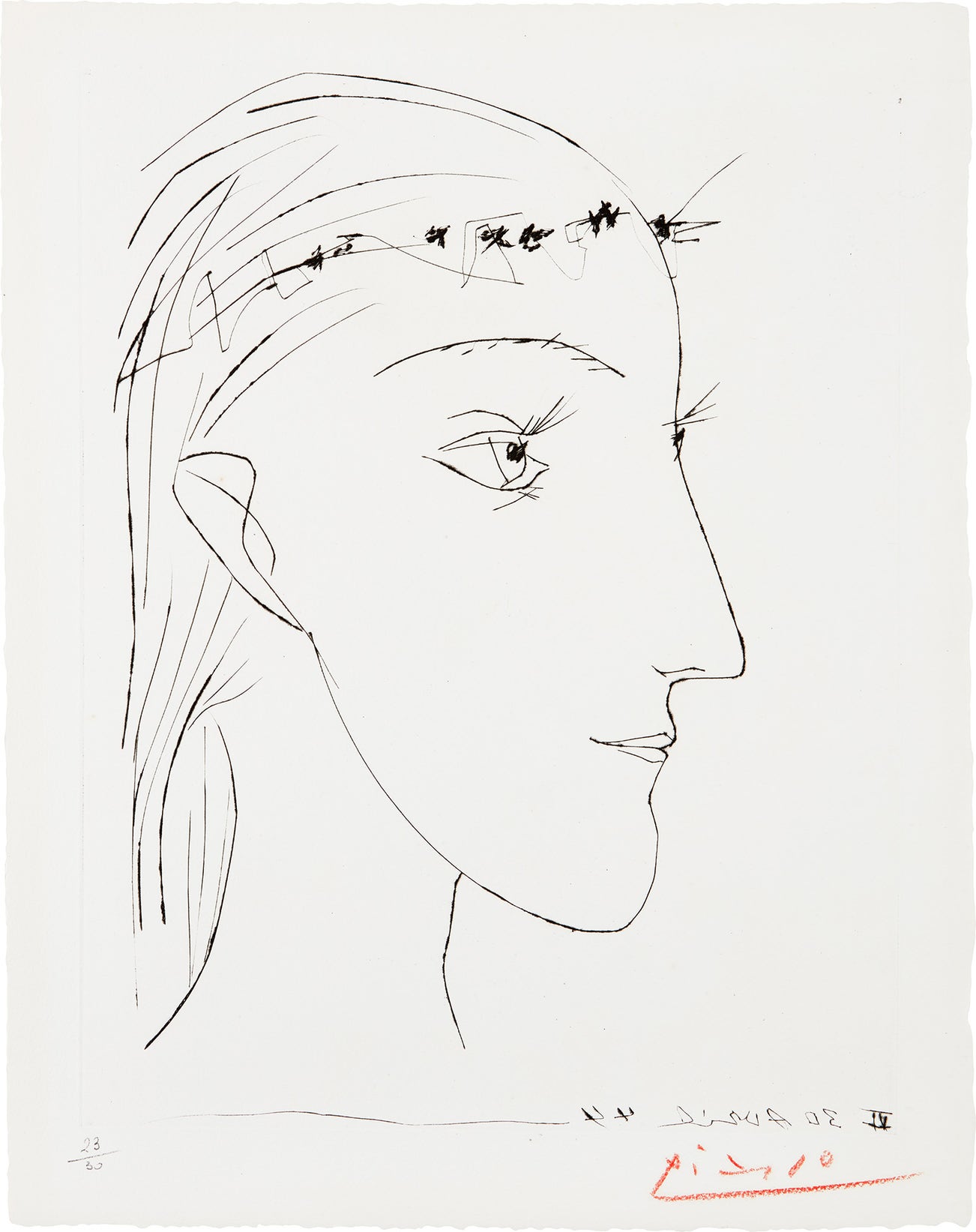 Picasso drew this image for the sixth tale titled Le Bois d'enfer (Hell Woods), the author anticipates his own old age. He tells how the 80 year old Monsieur Toesca faces the hard realities of life as he crosses the woods of hell with his double, Monsieur Troïka. This final tale is preceded by the sixth engraving of a woman's profile with a garland of flowers. The image may be compared with certain portraits of Marie-Thérèse Walder but also of Dora Marr. (Patrick Cramer Pablo Picasso, the Illustrated Books, 1983, p. 176)
