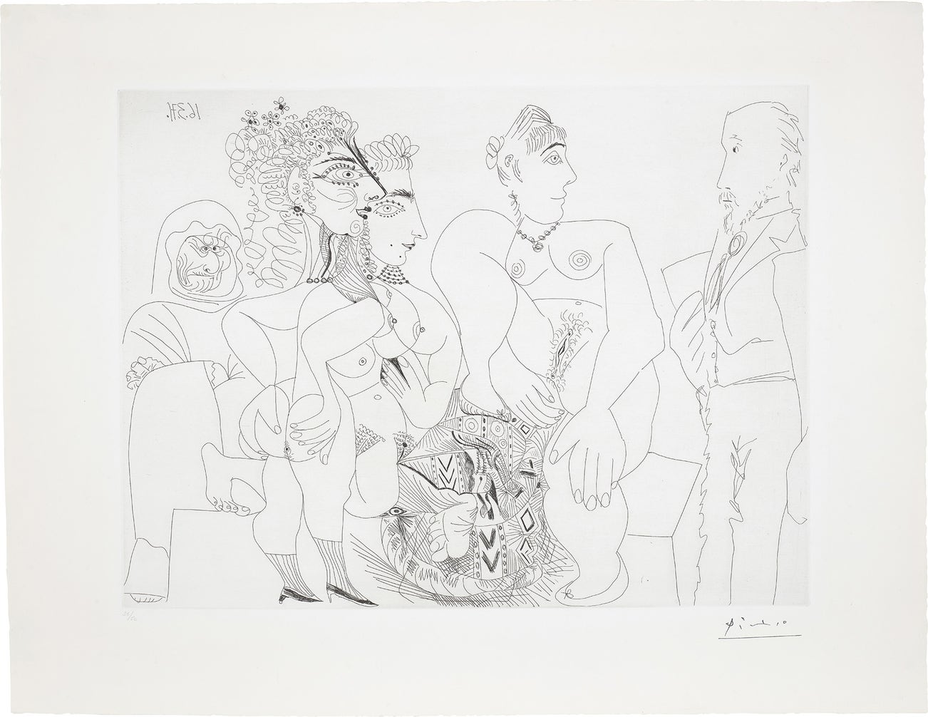 Maison close, Degas avec son album, Célestine, trois filles, et un pouf Marocain (Brothel, Degas with his Album, Célestine, Three Ladies, and a Moroccan Pouf), plate 87 from Séries 156 (Bl. 1942, Ba. 1951)