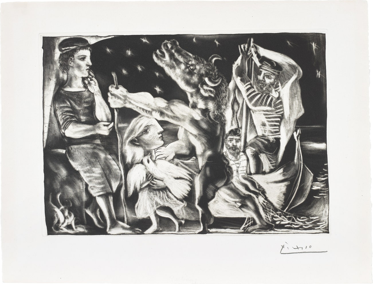 Minotaure aveugle guidé par Marie-Thérèse au pigeon dans une nuit étoilée (Blind Minotaur Guided Through a Starry Night by Marie-Thérèse with a Dove), plate 97 from La Suite Vollard (Bl. 225, Ba. 437)