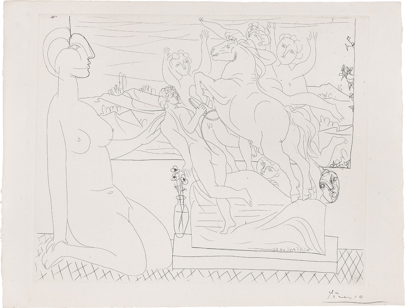 Marie-Thérèse agenouillée contemplant un groupe sculpté (Marie-Thérèse Kneeling, Studying a Sculpted Group), plate 66 from La Suite Vollard (Bl. 175, Ba. 328)