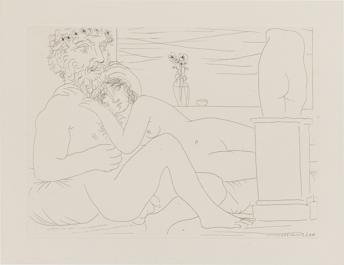 Sculpteur au repos avec son modèle, anémones et petit torse (Sculptor at Rest with his Model, Anemones and Small Torso), plate 53 from La Suite Vollard (Bl. 162, Ba. 315)