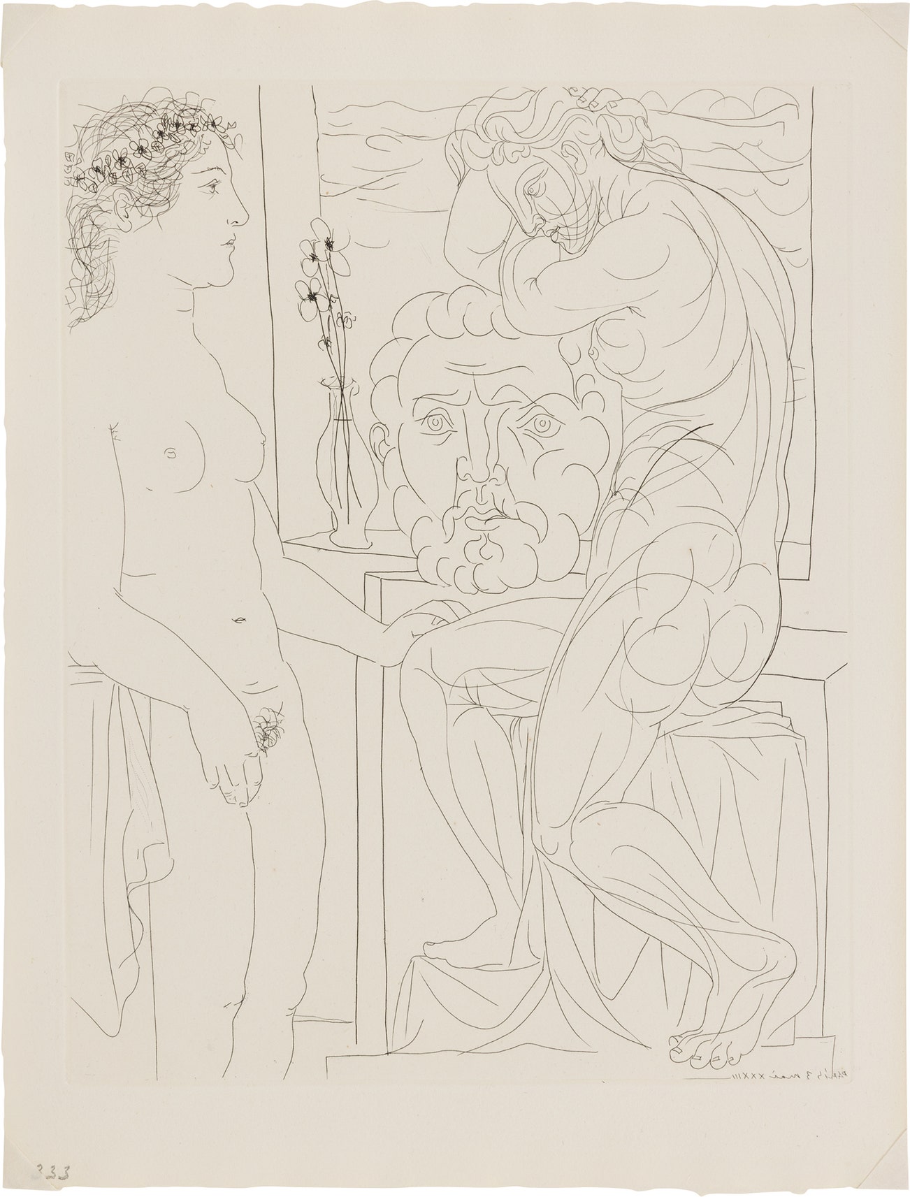Femme laide devant la sculpture d'une Marie-Thérèse athlétique appuyée sur un autoportrait du sculpteur (Ugly Woman before a Sculpture of an Athletic Marie-Therese, Leaning on a Self-Portrait of the Sculptor), plate 72 from La Suite Vollard (Bl. 185, Ba. 344)