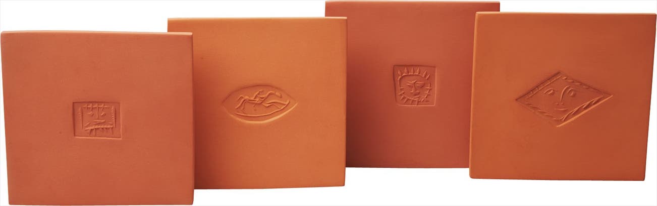 Carreaux aux Motifs: (Little Square with Face); (Oval with Horse); (Little Square with Sun); and (Lozenge with Face)
