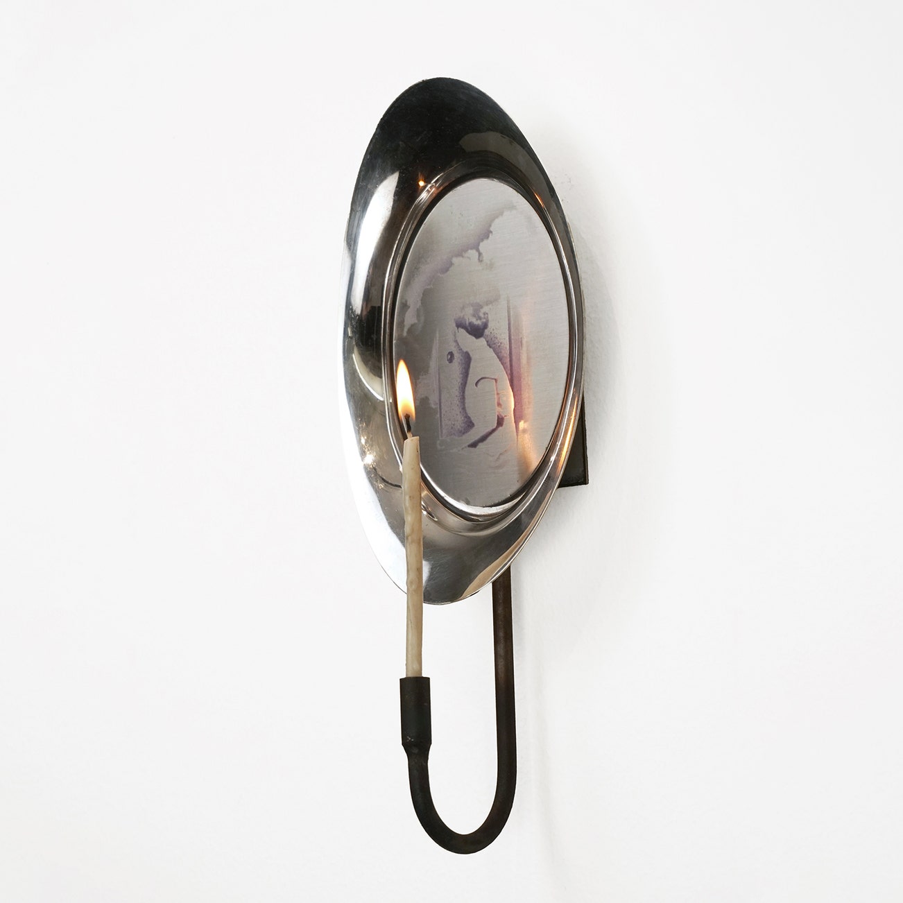 V print on stainless steel, found tray, metal, candle