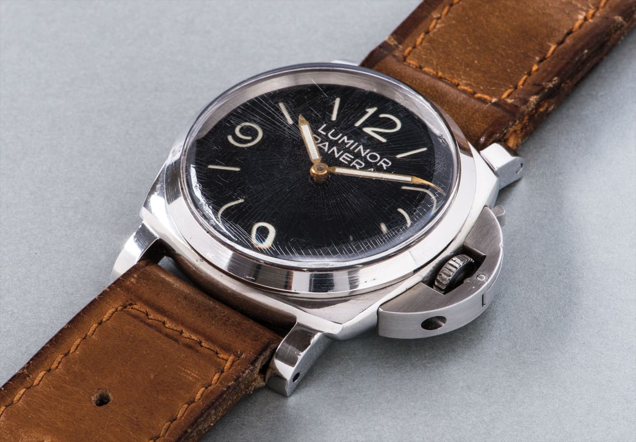 To date, only 64 Panerai reference 6152-1 models with a Rolex movement and Panerai crown protecting device are known, amongst them 33 have the Luminor Panerai dial featured in the present lot. The watch is further accompanied by a copy of a matriculation document attesting to the fact that this exact watch belonged to an accomplished, high ranking Rear Admiral (Contrammiraglio) of the Marina Miltare based in La Spezia, Italy. Considering that the present watch is documented as belonging to a high ranking naval officer, issued to be used underwater and in harsh elements, the condition of the present lot is surprising and amongst the best preserved examples we have seen. Further accompanied with its original movement dust cover, and fitted with its original leather strap, original steel buckle, and original crystal, it’s a superb example for the aficionado of rare, military-issued timepieces.