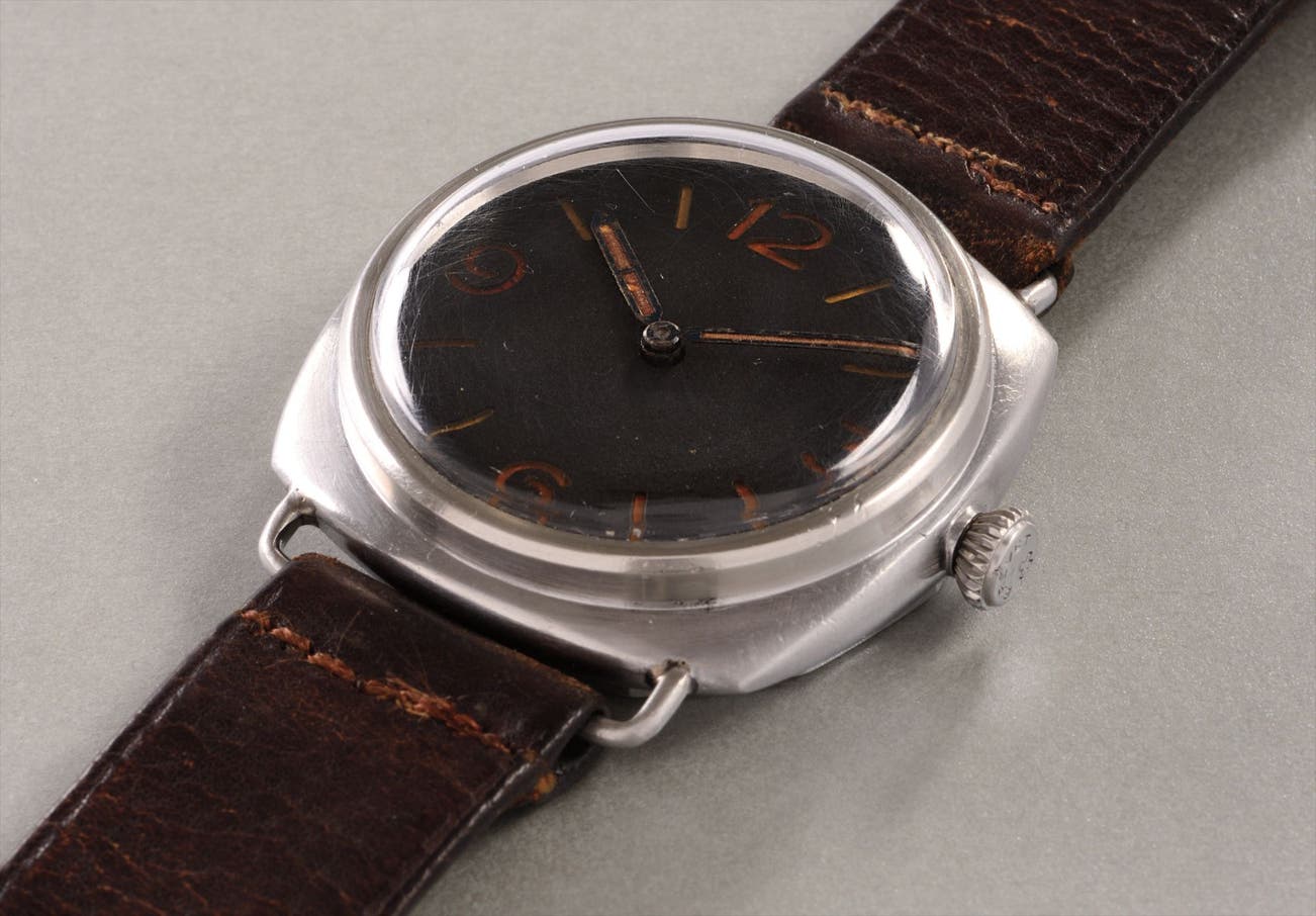 The present lot is fresh to the auction market, and is part of the Type D classification (made between 1943 to 1944). Reference 3646 was made by Rolex for Panerai following strict technical requirements, notably a 47 mm wide (for underwater legibility) cushion-shaped case with soldered curved wire lugs, screw down "onion" crown, 12-sided case back and a Perspex crystal. What makes the present lot extraordinary is its “as found” condition, preserved in exactly the same state of preservation as when the watch was last used so many decades ago. For example, the dial of the present example is completely unrestored and in beautifully aged condition. The luminous markers and hands have developed an amazing, bright orange patina so rarely seen, occurring as a result of being stored unused in a totally dark, air-free environment for perhaps decades.