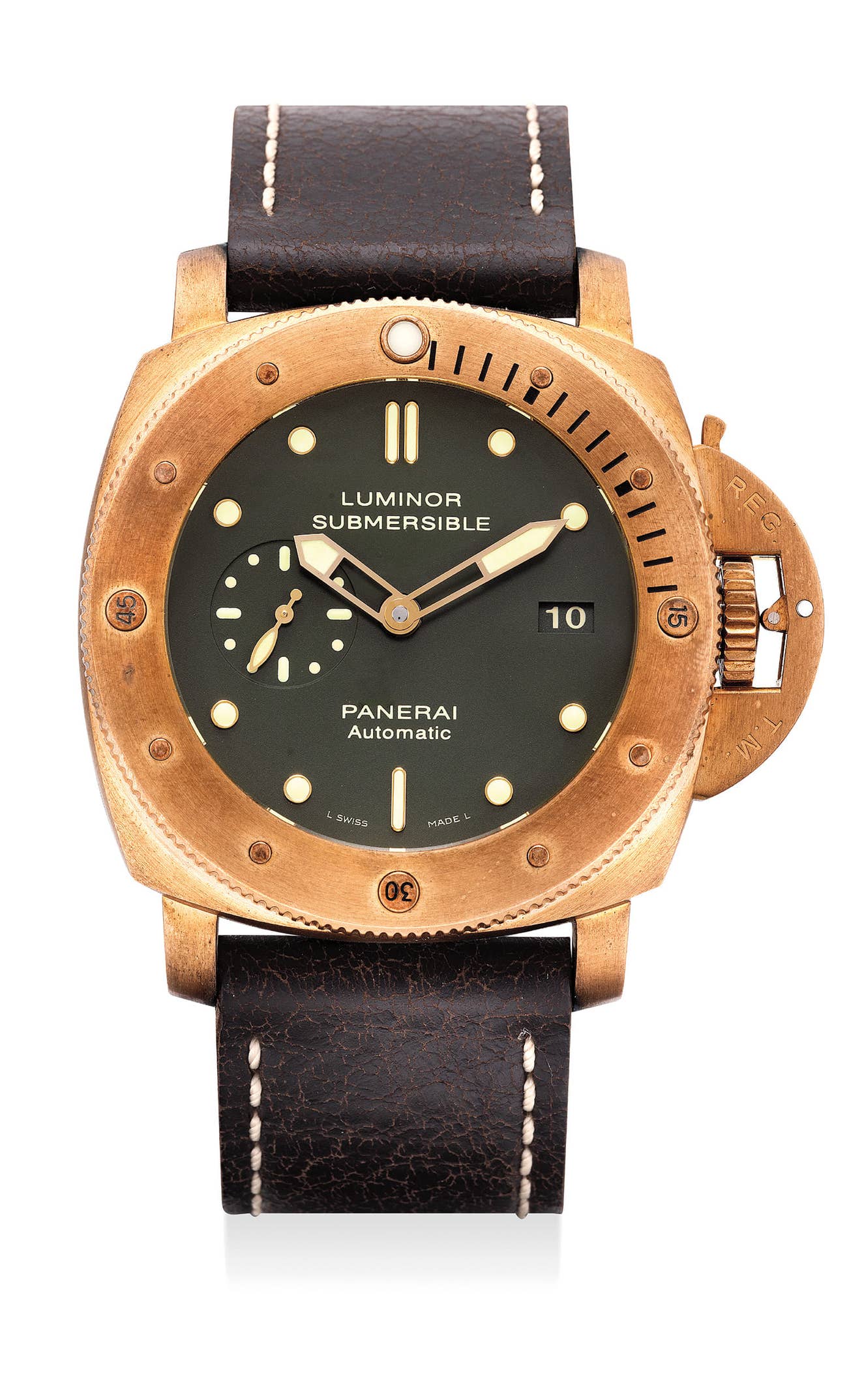 The model with brushed bronze case and green dial have a distinctly 1950s vibe and charm. Over time, bronze develops a patina due to oxidation and the present example has a warm brown hue overall, but with the characteristic green patina that occurs with time between the lugs. With the in-house caliber P. 9000 automatic movement, the watch has a 3-day power reserve. PAM 382 is highly sought out by Panerai collectors for its unique metal case and strong masculine appeal.