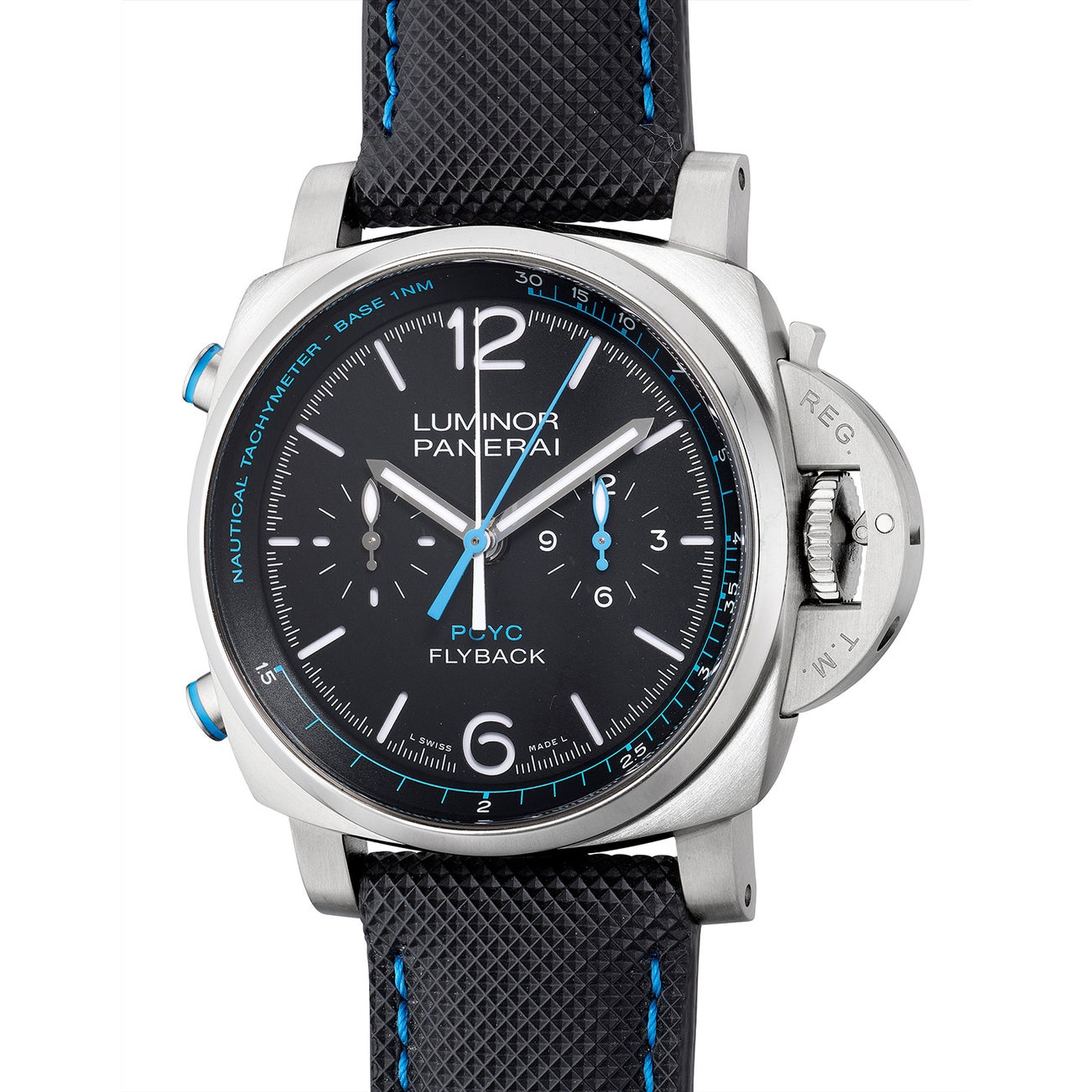 Referenced the PAM 764, the limited edition flyback chronograph timepiece is by all means a Panerai. Featuring the firm’s signature sandwiched dial, the timepiece also boasts a large 44mm diameter case executed in brushed titanium to enhance its light comfort on the wrist. Designed for nautical adventures, the dial is equipped with a nautical tachometer scale with two central chronographic hands one in blue (to capture seconds elapsed) and the other in white (to capture minutes elapsed) activated via two chronographic pushers positioned on the left side of the caseband.