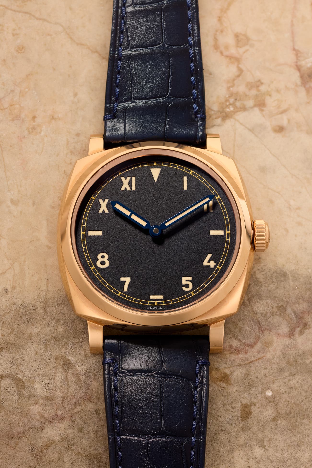 • Released in 2017, the PAM740 is a modern iteration of the famed Radiomir with a “California” dial. The limited edition was produced in 300 pink gold examples, with the present timepiece numbered 158. The vintage-inspired dial features SuperLuminova numerals, and like other special editions, lacks the Panerai Radiomir signature and logo. Powered by the manual caliber P. 1000 with 3-day power reserve, the high-grade movement is fitted with a specially constructed bridge and two supports to secure the balance wheel for robust shock resistance.