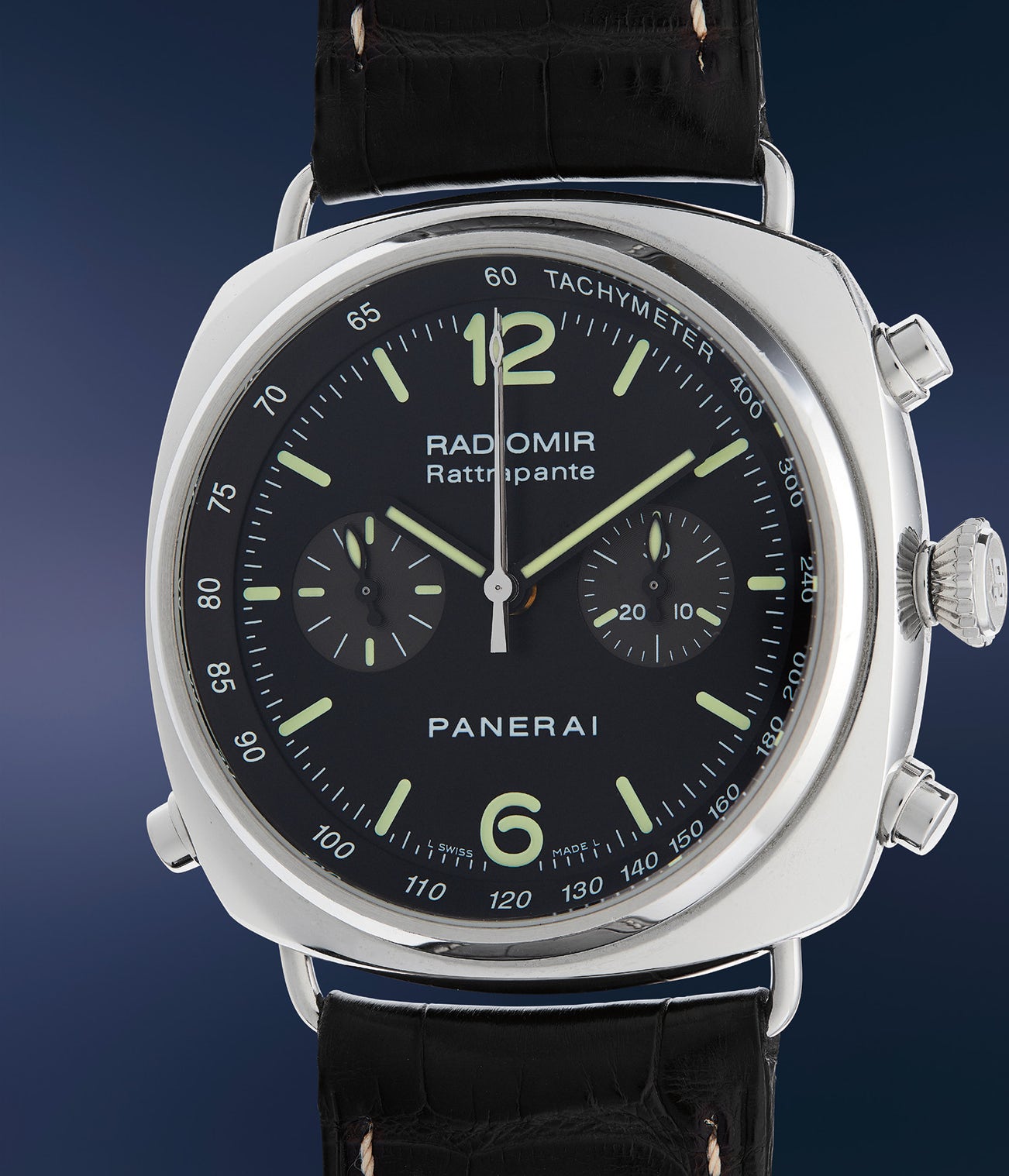 The Radiomir Rattrapante is classic in design with an oversized cushion-shaped case, wire lugs and polished bezel. The rattrapante, or split-seconds, mechanism is one of the most difficult and complicated types of chronograph functions to produce, and manufacturers typically make very limited numbers due to the technical difficulty of making such movements. As such, the present watch was made in very limited numbers only.