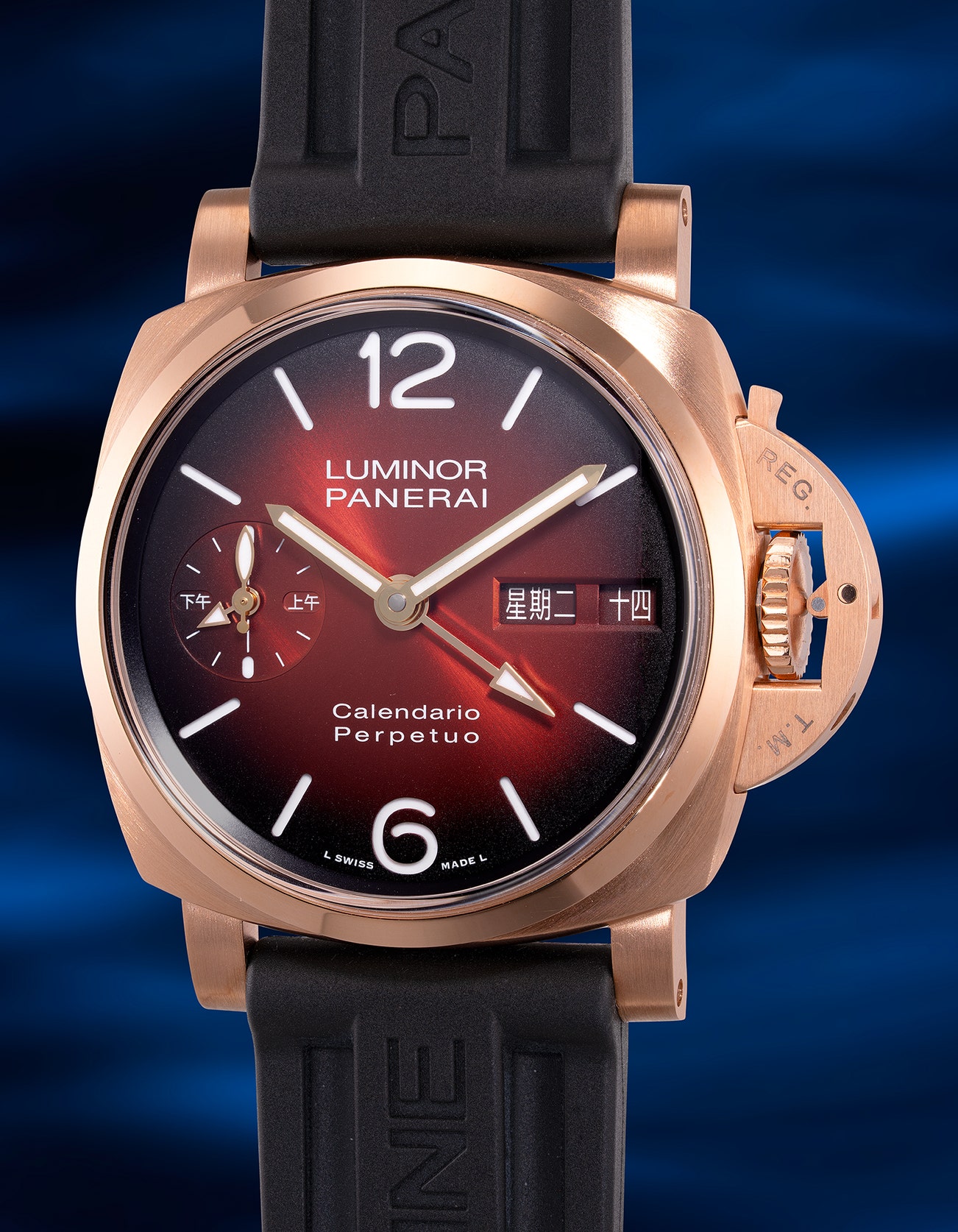 - Encased in Panerai’s innovative Goldtech material, an alloy that combines pure gold with platinum and copper. This watch showcases a warm, rich hue while enhancing durability, making it a fitting addition to the sports watch category. The sunburst burgundy dial features a Chinese calendar, elegantly complementing the case while maintaining a subtlety on the wrist.