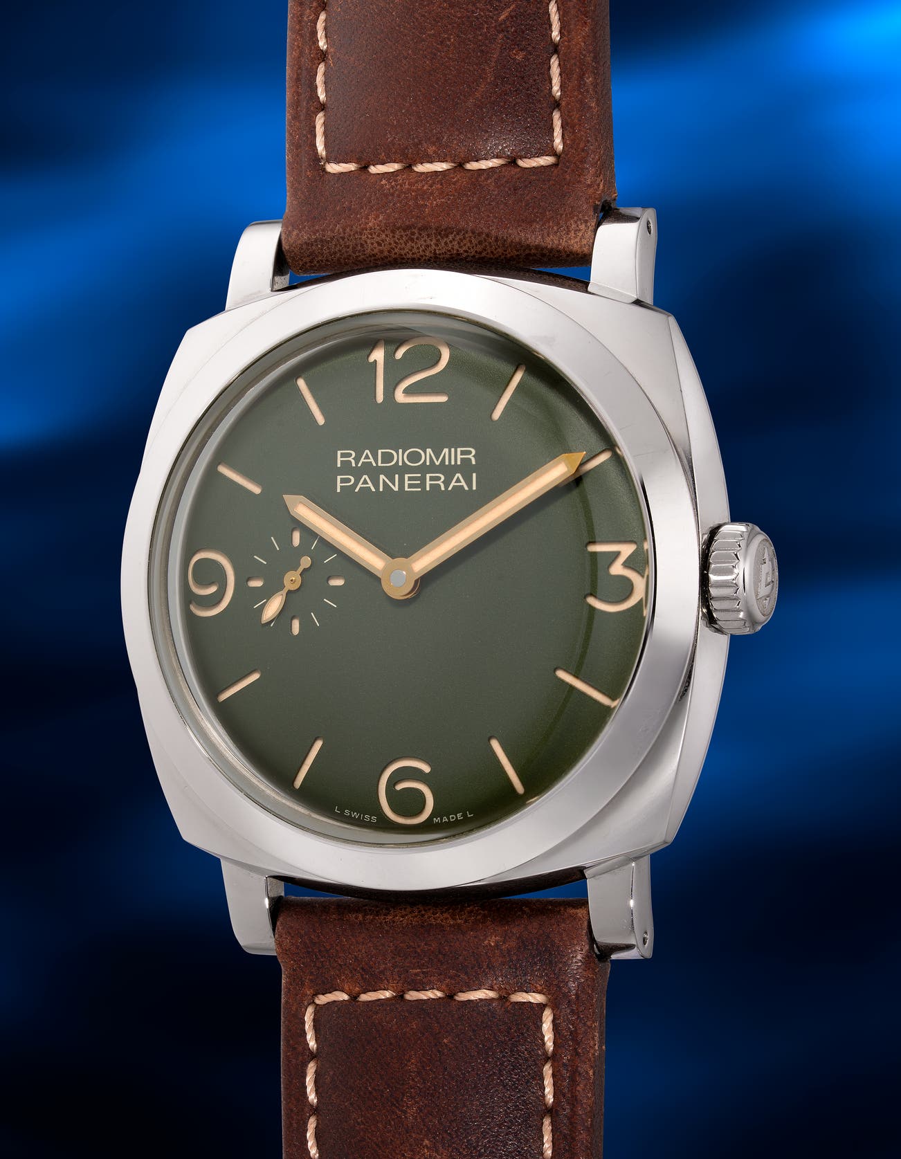 • The present example is paired with a natural brown leather strap, which provides a warm and earthy contrast to the watch’s matte military green dial, enhancing its vintage military aesthetic. Offered in excellent condition and accompanied by its full set of original accessories, including an additional fabric strap, this timepiece is a compelling choice for collectors. It embodies Panerai’s enduring connection to its naval heritage, while showcasing the brand’s commitment to modern craftsmanship. With its distinctive design, the present timepiece is ideal for enthusiasts who appreciate both historical significance and contemporary horology.