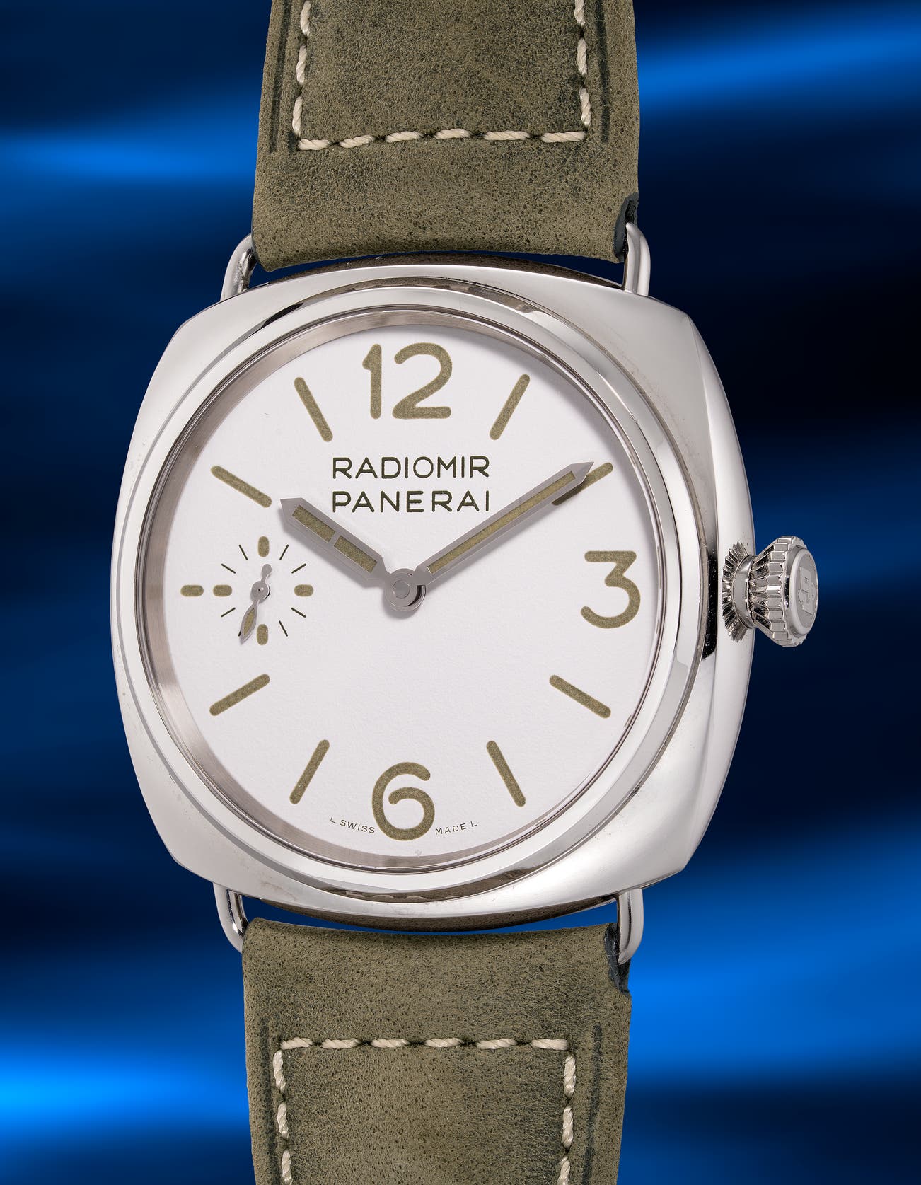 • This present example features a white grainy dial that offers a cleaner, more minimalist aesthetic compared to the brown dial variant. The green suede strap complements the green lumed Arabic numerals and hour markers, creating a harmonious and visually balanced appearance. Presented in well-preserved condition and accompanied by its original accessories, it is an ideal timepiece for emerging collectors seeking a refined yet distinctive entry into the Panerai world.