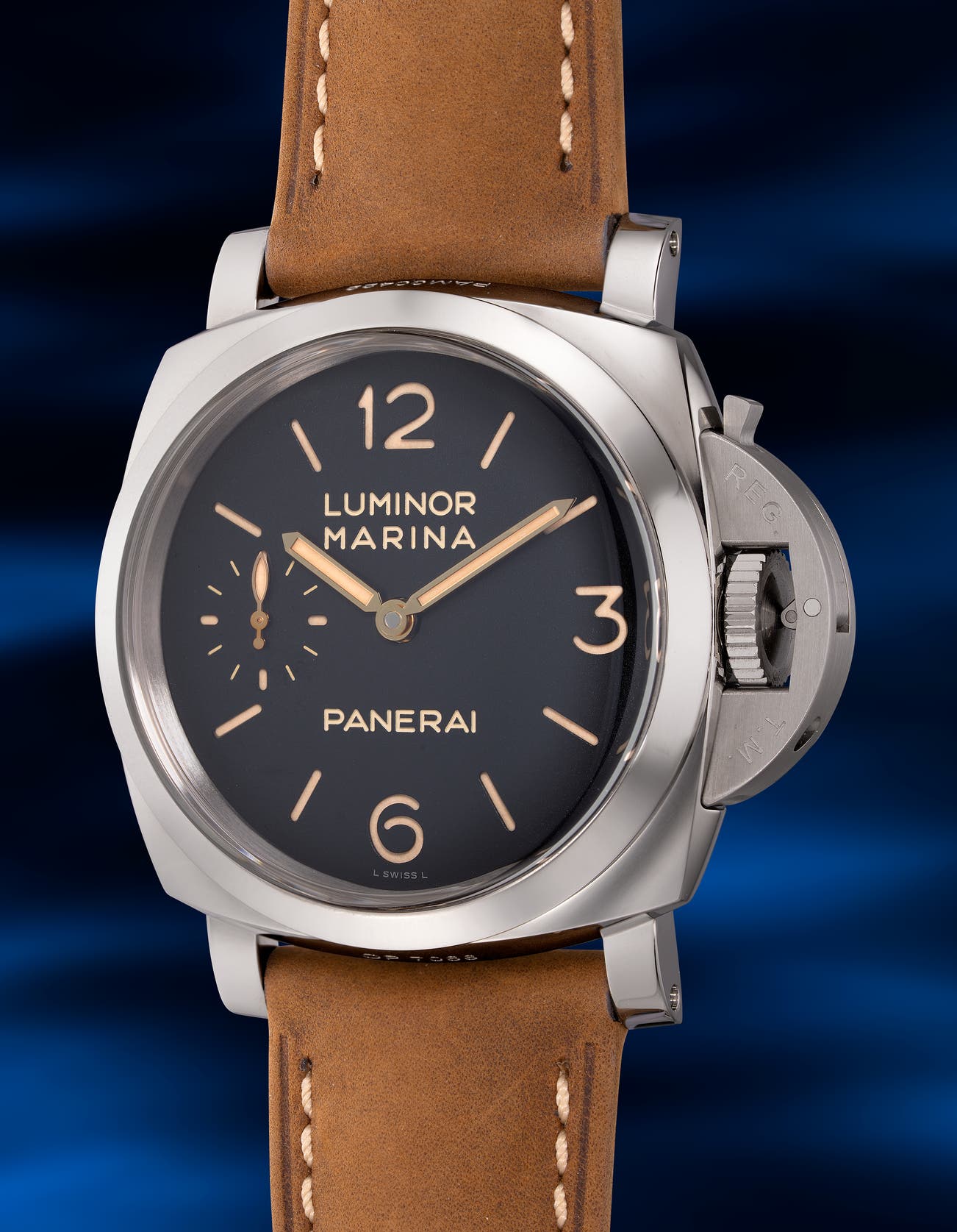 - The domed sapphire crystal is one of its signature features, while the dial boasts Panerai’s famous sandwich construction, where the markers are cut out, allowing luminous paint beneath to shine through. The cream-colored luminous paint on the markers and hands enhances its vintage appeal.