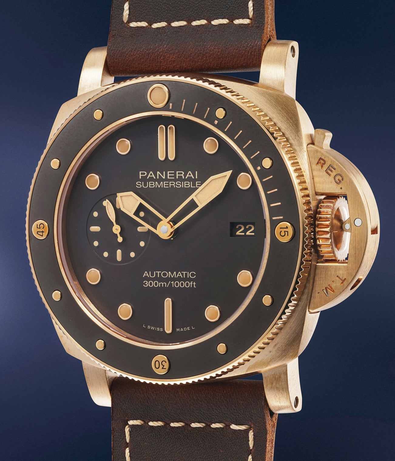 In 2011, Panerai introduced the PAM00968 Luminor Submersible encased in a 47mm diameter bronze case, exemplified by the present example part of a limited edition of 1,000 pieces. Its apt nickname “Bronzo” comes from the Italian word for bronze, and from a technical standpoint the watch features an in-house cal. 9010 with up to 3 days of power reserve via two barrels.