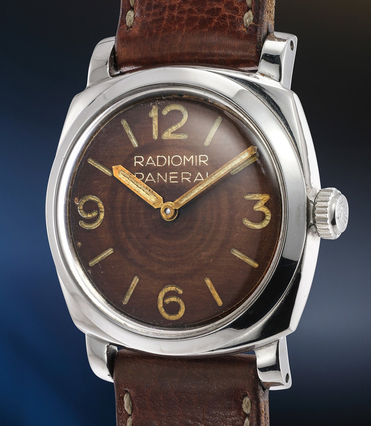 It is however the extraordinary “Radiomir Panerai” sandwich dial that makes the present reference 6154 unique, and one of the most beautiful of all known examples. The ‘tropical’ dial has aged to a superb and harmonious shade of chocolate brown, with mesmerizing, concentric rings of discoloration. The dials of the 6154 were especially susceptible to fading due to a flaw in the paints used. Among all 6154 examples known, less than a handful have survived with such a lovely, deep brown color.