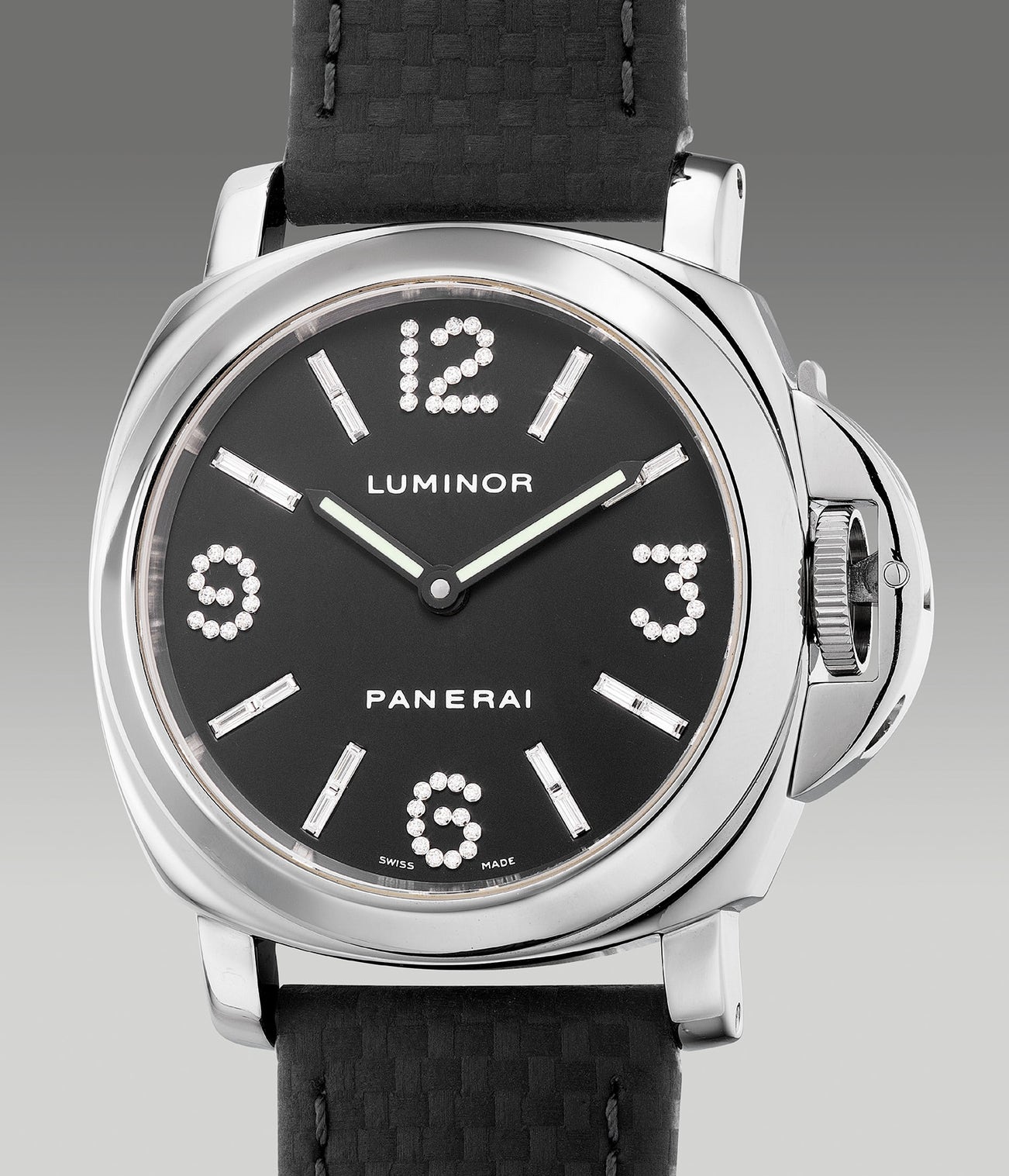 The present example of a Luminor with baguette and brilliant-cut diamond-set indexes is presented in excellent overall condition. Limited to 90 pieces, only a few have appeared in the market.