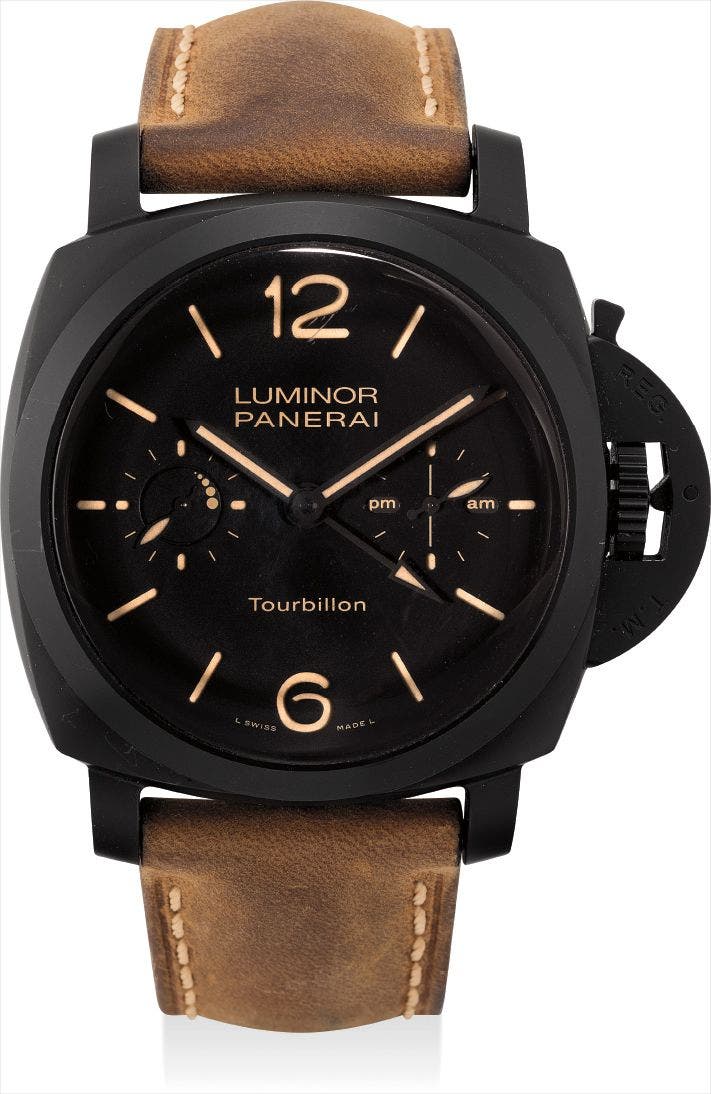 A very fine and rare black ceramic perpendicular rotating tourbillon dual time cushion-shaped wristwatch with day and night indicator and power reserve, numbered 67 of a limited edition of 100 pieces