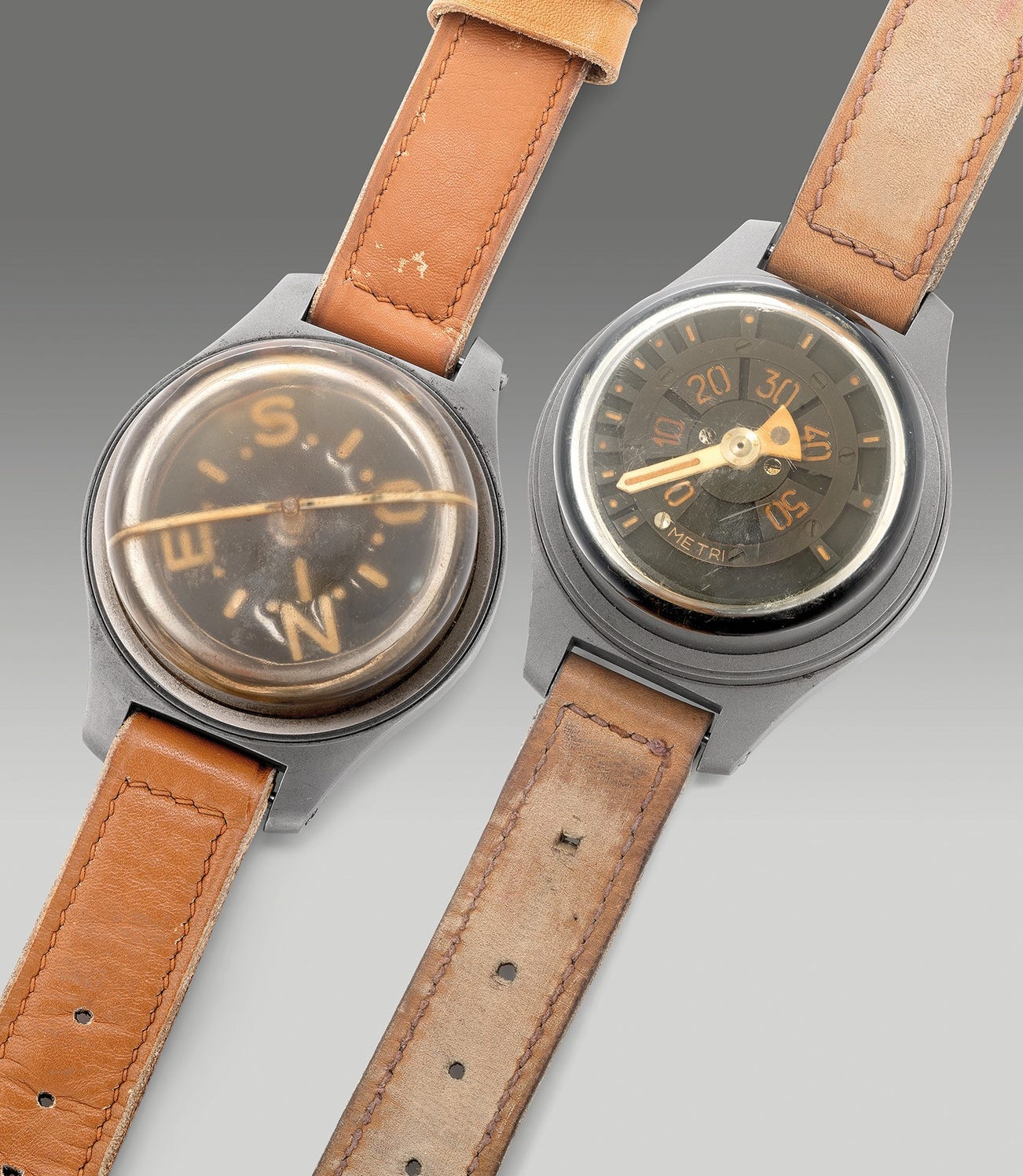 An extremely rare pair of sand blasted steel diver’s compass and depth gauge
