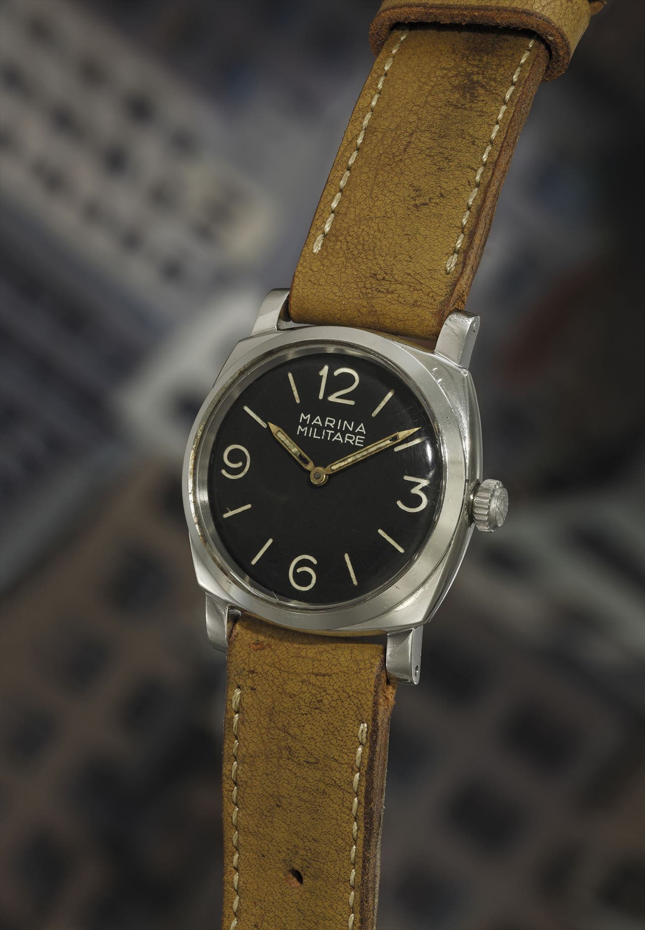 A very rare, oversized, and attractive stainless steel diver’s wristwatch with black dial made for the Italian Navy.