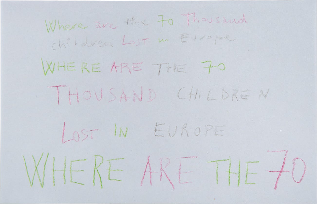 inscribed 'Where are the 70 thousand children Lost in Europe WHERE ARE THE 70 THOUSAND CHILDREN LOST IN EUROPE WHERE ARE THE 70' to the centre; further signed and dated 'Paola Pivi 2/19/19' on the reverse